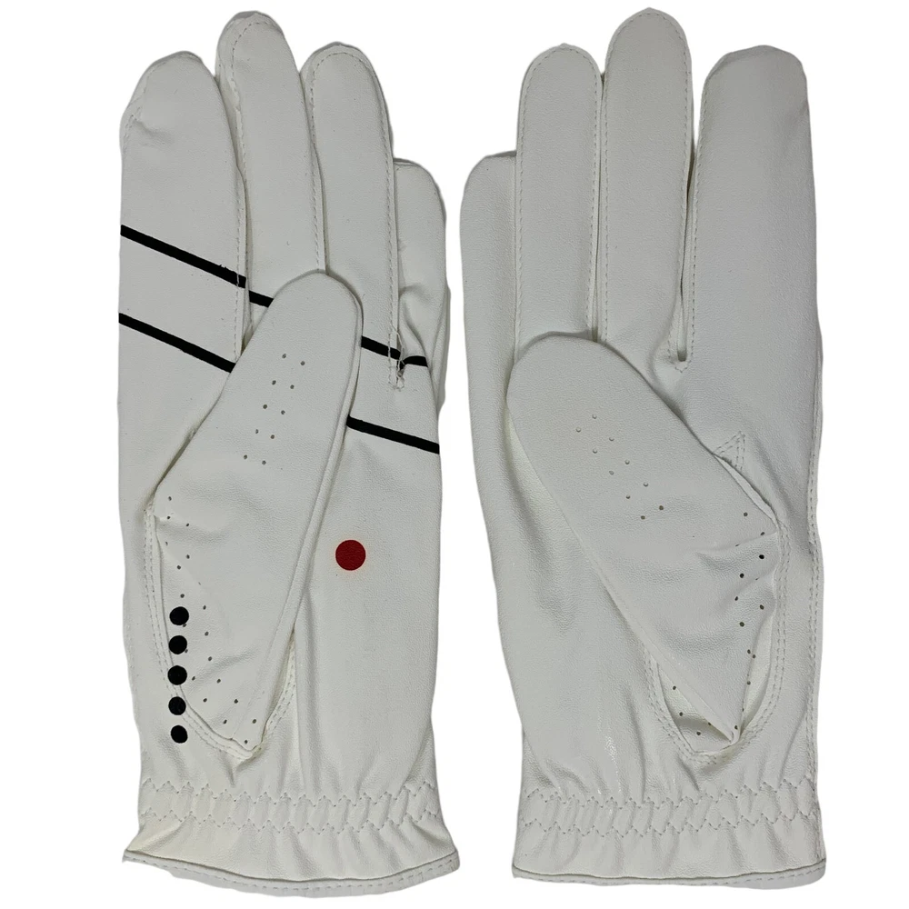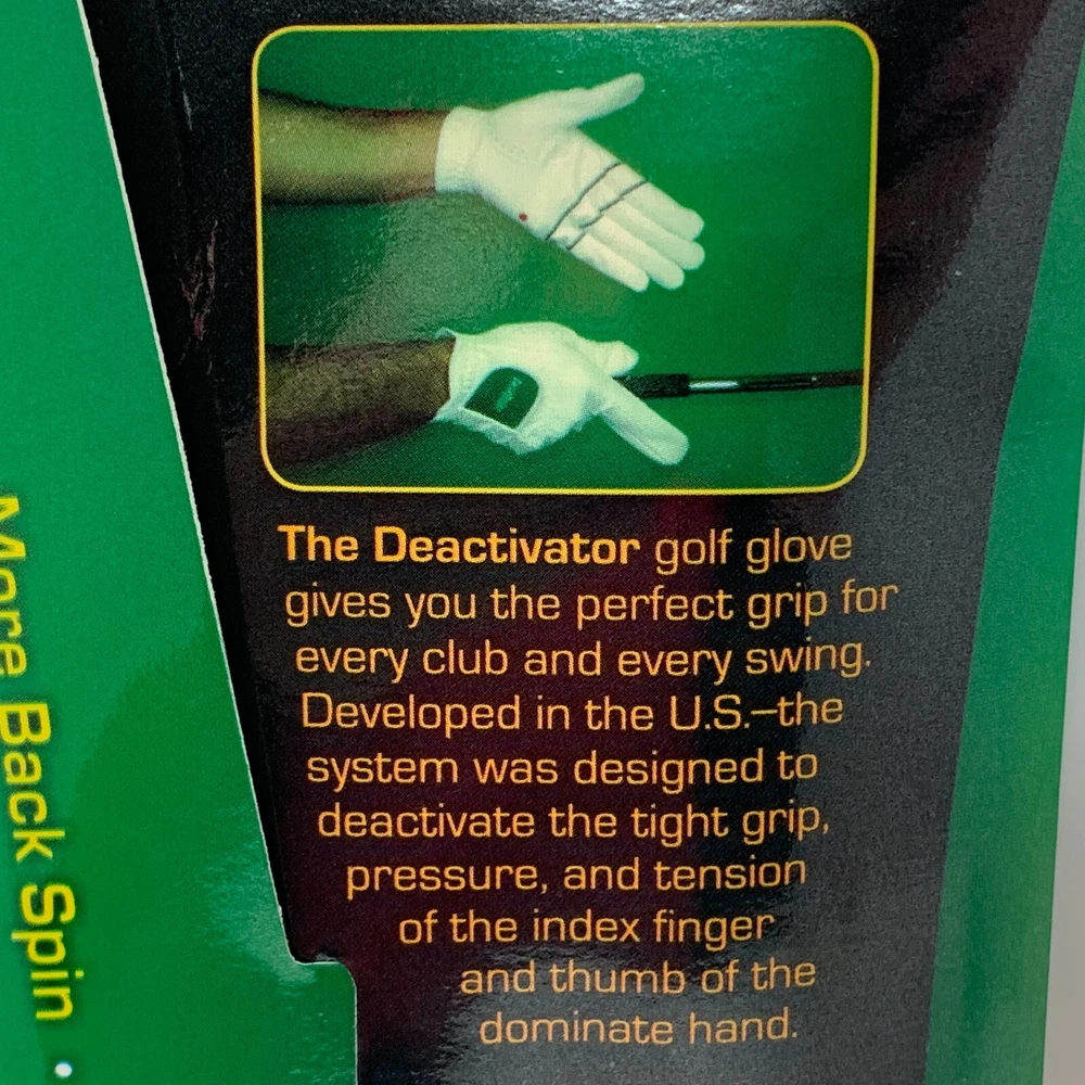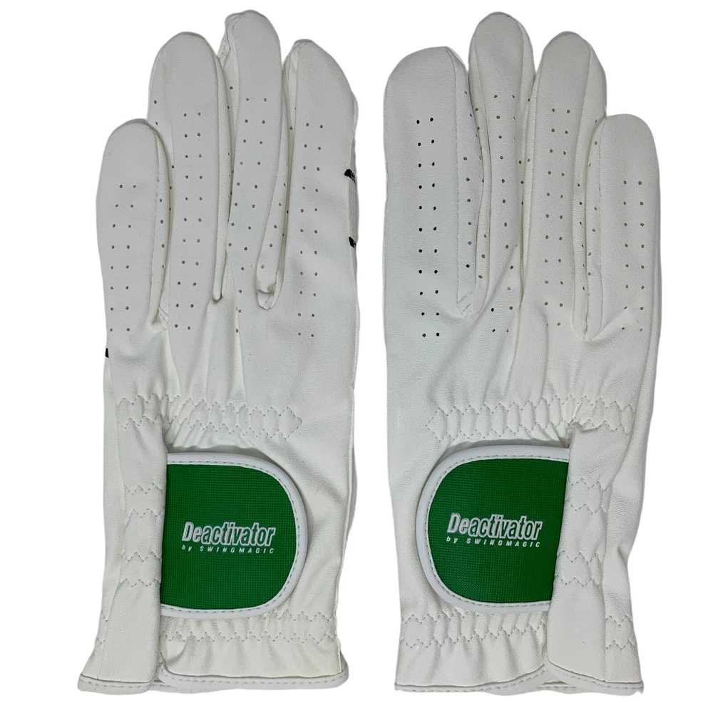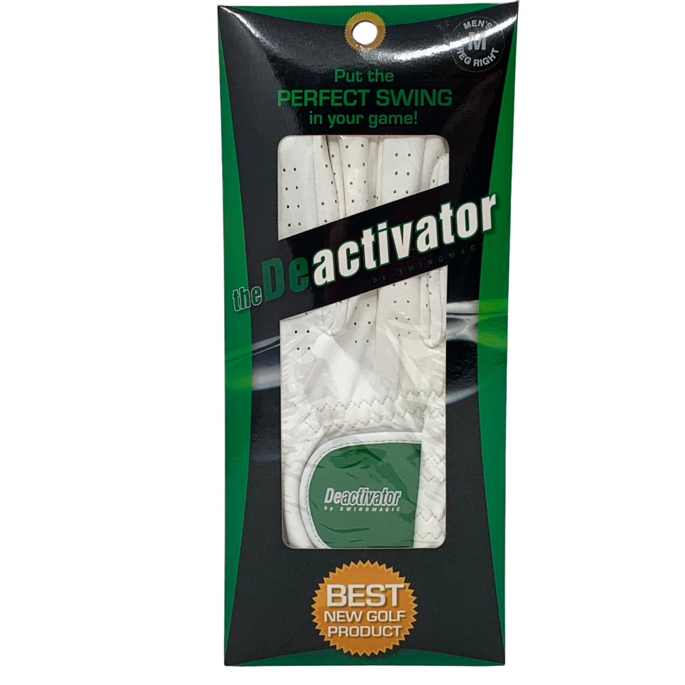 The Deactivator by SwingMagic is a pair of white golf gloves made with built in grip guides and buffers. The trail hand Deactivator glove is designed with formed plastic brace in the index finger to keep it straight and a pad on the thumb to eliminate the tight grip pressure created when you squeeze the index finger and thumb too tightly on the grip during the swing. The printed guides on the lead hand glove show you how to properly grip the club to deliver a square clubface on impact. By using The Deactivator you will activate the correct arm and hand muscles in the golf swing, allowing you to spend more time concentrating on things like managing the course and what type of shot you are going to hit instead of how you are going to make it happen! MEASUREMENTS: Measure from top of middle finger to wrist S - 7.25 inches M - 7.5 inches L - 8 inches XL - 8.5 inches WHAT MAKES THE DEACTIVATOR DIFFERENT? The Deactivator is an amazing golf swing training aid designed to help hit the ball higher, straighter and farther more often. The Deactivator will help you quickly improve by giving you a neutral perfect grip and allowing you to feel the proper grip pressure needed to have a consistent swing. The Deactivator will train you to deactivate unwanted muscle tension in the golf swing. The Deactivator will soften your grip pressure so your hands can release properly through impact. The Deactivator's built in alignment guides keep your lead arm and club in line creating a more solid strike with your arms and hands leading the club thru impact. The Deactivator is perfect for beginners or experienced players. The Deactivator will help you cure your hook or slice in minutes.