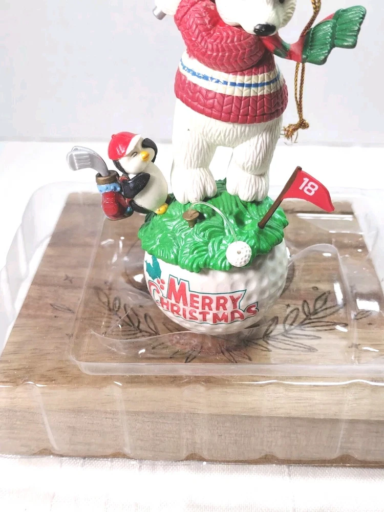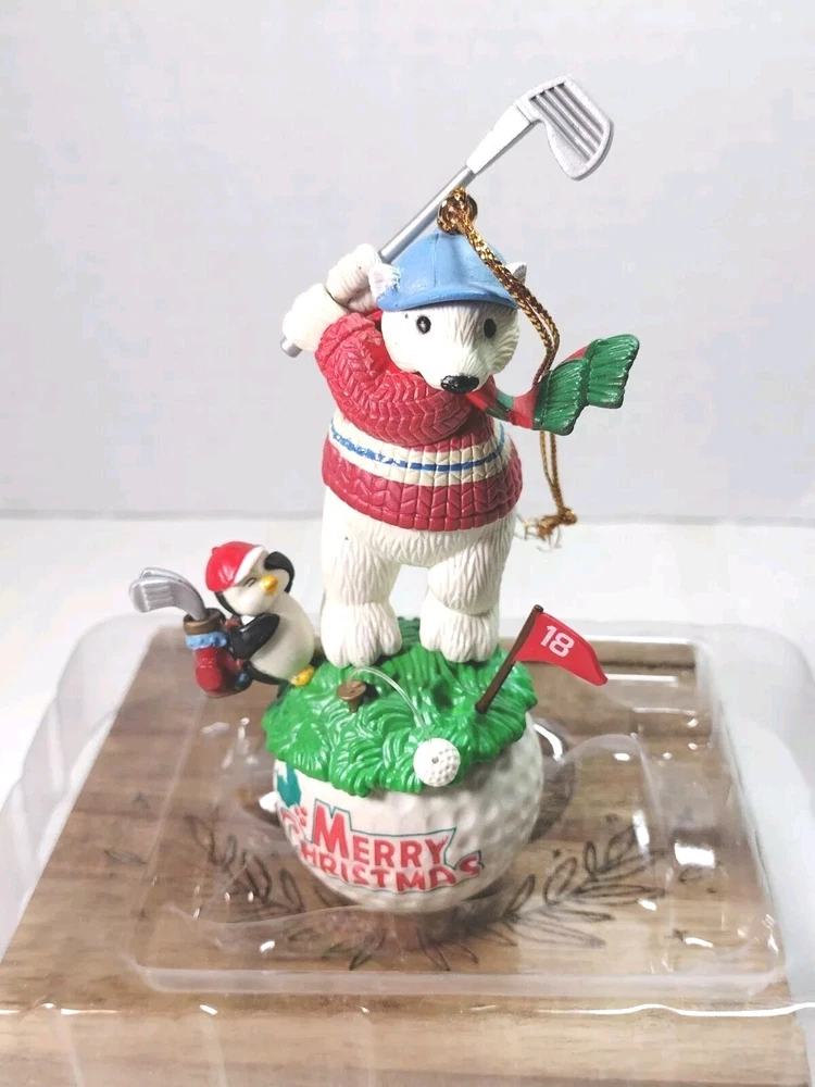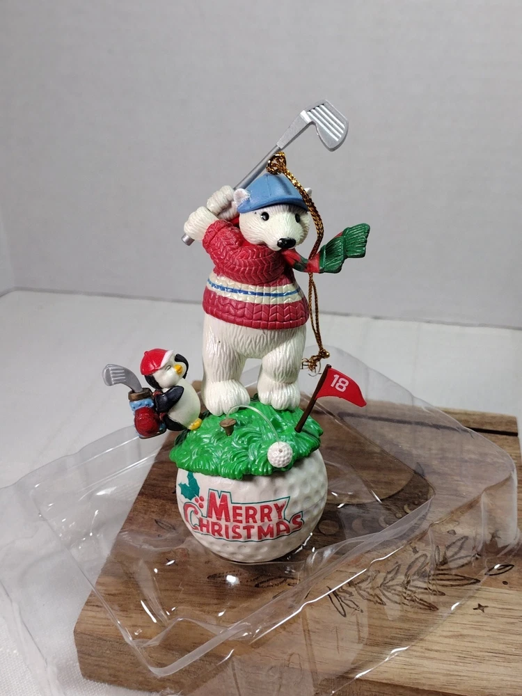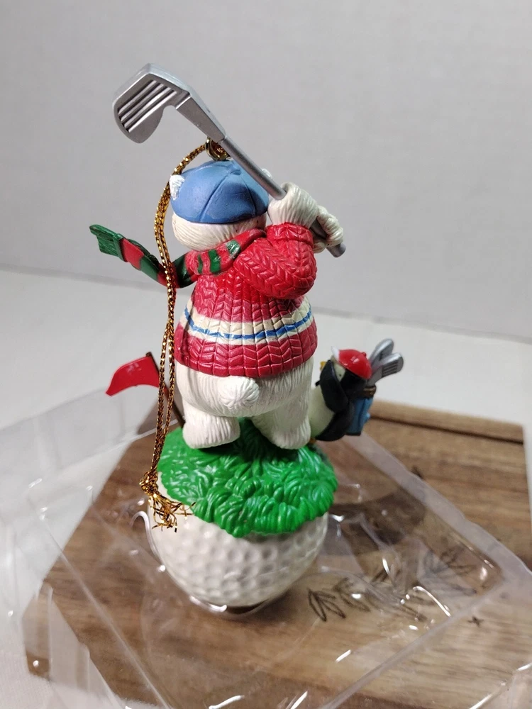Adorable vintage Christmas tree ornament polar bear and penguin friends golfing together pre-owned but in good condition no cracks no chips