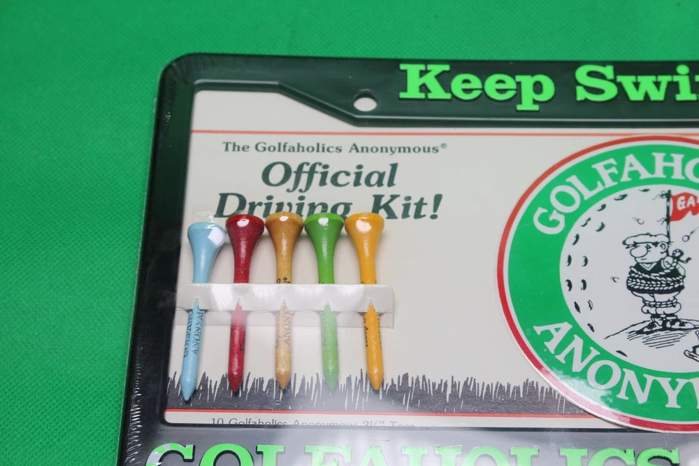 Show off your love for golf with this stylish Golfaholics Anonymous Keep Swinging metal license plate frame. The frame fits standard size license plates and features a sleek design with the Keep Swinging slogan. It is perfect for any golf enthusiast who wants to add a touch of personality to their vehicle. Crafted by Thought Factory in the United States, this license plate frame is a high-quality product that is built to last. It is a great addition to any collection and makes a perfect gift for any golfer. Get yours today and keep swinging with pride!