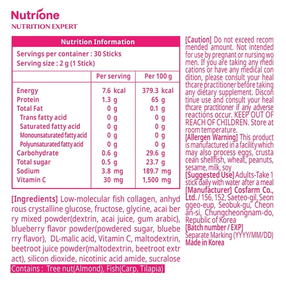 Korean No.1 Inner Beauty Brand Collagen, also called as Low-molecular weight collagen in South Korea. Experience one stick of magic before sleep for desired skin regeneration. Low Molecular Weight Collagen has the high absorbing rate of 1,000 Da (Dalton) in our body that increases skin elasticity and supports bone density. K-Beauty Collagen, Mix Berry Flavored delicious and nutritious collagen powder, Awarded K-Brand Preference Collagen. Halal Certified Low-Molecular Collagen : Skin regeneration product to absorb collagen before sleep. Our low-molecular (1,000 DA) fish/marine collagen allows for quick and efficient absorption into your body, boosting the recovery of your skin, muscles, and bones. Easy on-the-go Collagen : With our single-serve collagen stick packaging, you can take it anywhere with you (e.g. gym, workplace, travel, and others), supporting and fostering a more consistent skin-care routine. Net Wt. 60g. (2g x 30 Sticks). Take One Stick a Day. Beneficial Ingredients: Each stick contains 1,200 mg of fish collagen with vitamin C, glycine for the best possible results. Mix Berry Flavor: Great tasting mixed berry flavor for easy consumption with no mixing with water required. Just take one stick by itself per day, or you can mix it with water or yogurt.