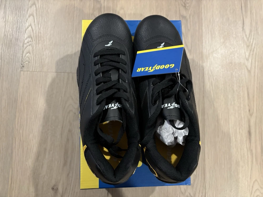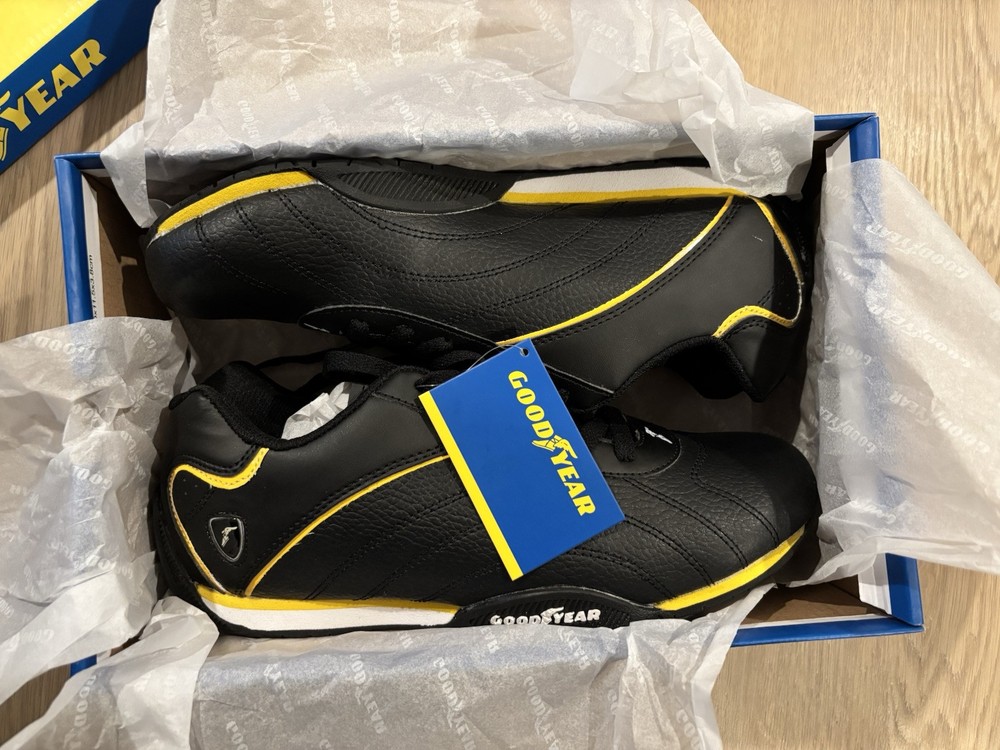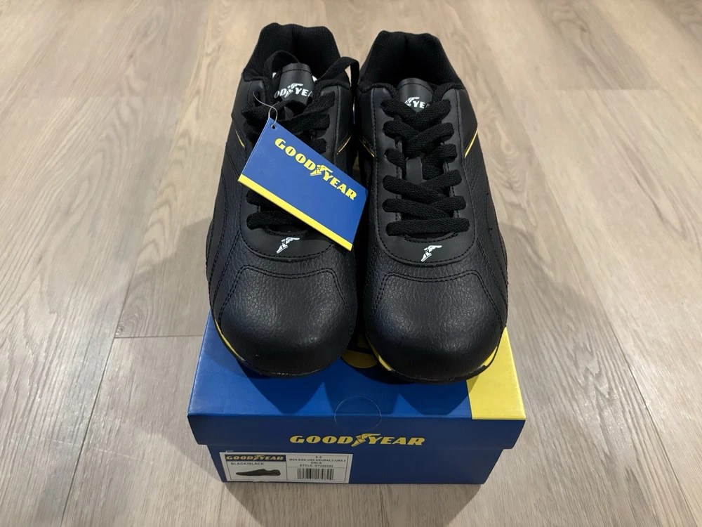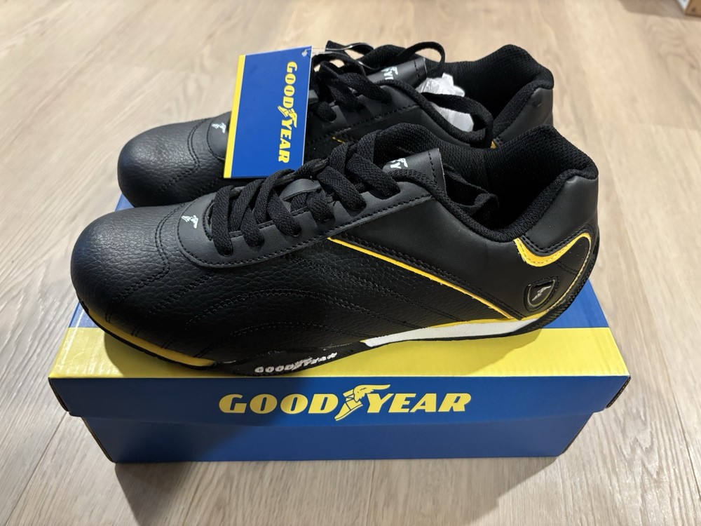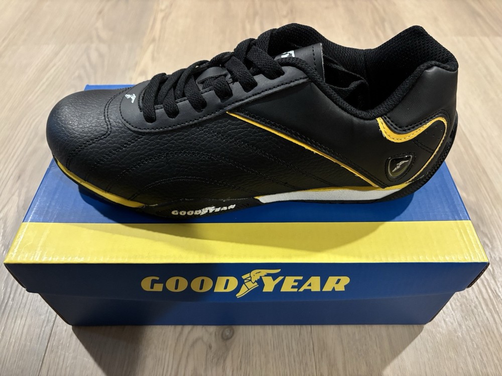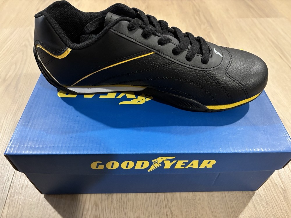 US Shoe Size:9.5Color:BlackVintage:NoPerformance/Activity:RacingCountry of Origin:ChinaType:AthleticSigned:NoBrand:GoodyearOccasion:ActivewearStyle:SneakerUpper Material:LeatherClosure:Lace UpDepartment:MenCustomized:No