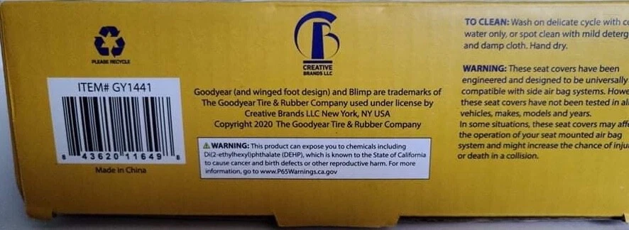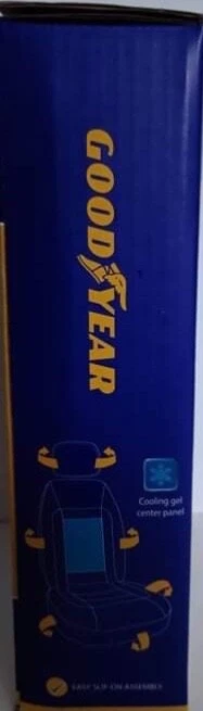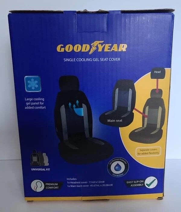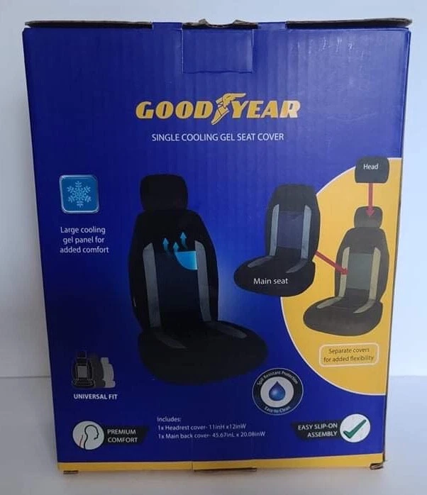 The Good Year cooling gel single slip-on cushioned seat cover in gray and black is a universal fit seat cover that comes with a headrest cover. It features spill-resistant protection, a large cooling gel panel, and is side airbag compatible. The cover is easy to install and clean, and is made with separate covers that are washable. It is designed to fit most vehicles. The seat cover is also California Prop 65 compliant. Product Details: ▪️Large cooling gel panel for added comfort ▪️Seat protection ▪️Separate covers for added flexibility ▪️Universal fit ▪️Premium comfort ▪️Easy slip-on assembly INCLUDES: 1 headrest cover 11inH x 12inW 1 main back cover 45.67inL x 20.08inW