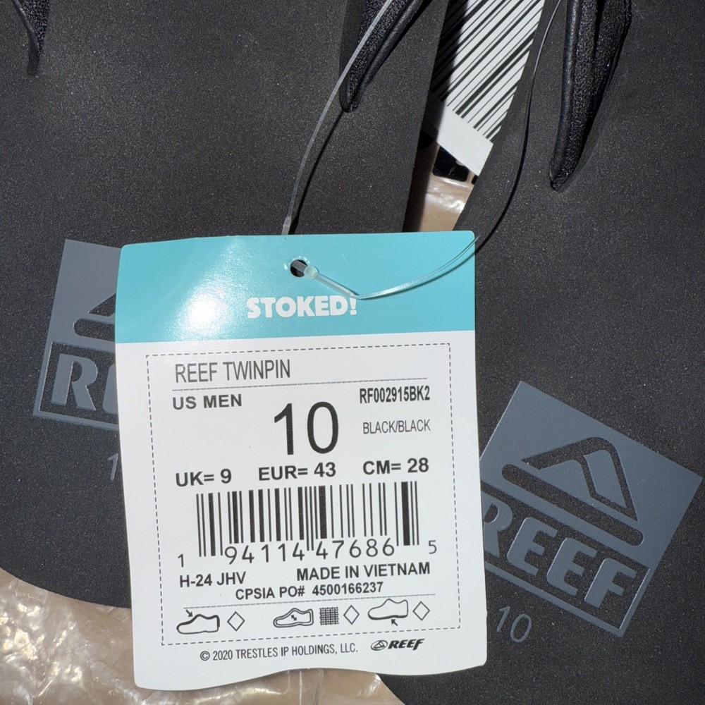 The Good_Reef men's Twinpin Flip Flop in Black/Black, size 10 US, is a stylish and comfortable sandal perfect for outdoor occasions. With a flexible plastic sole and leather lining, these flip flops provide support and durability. The flip-flop design with a thong strap and open toe offers a casual and fashionable look, making them a versatile choice for everyday wear. Imported by Reef, these sandals are designed for men and come in a sealed bag packaging. Perfect for those who enjoy a fashion casual lifestyle, these flip flops are a solid black color with a sleek design.