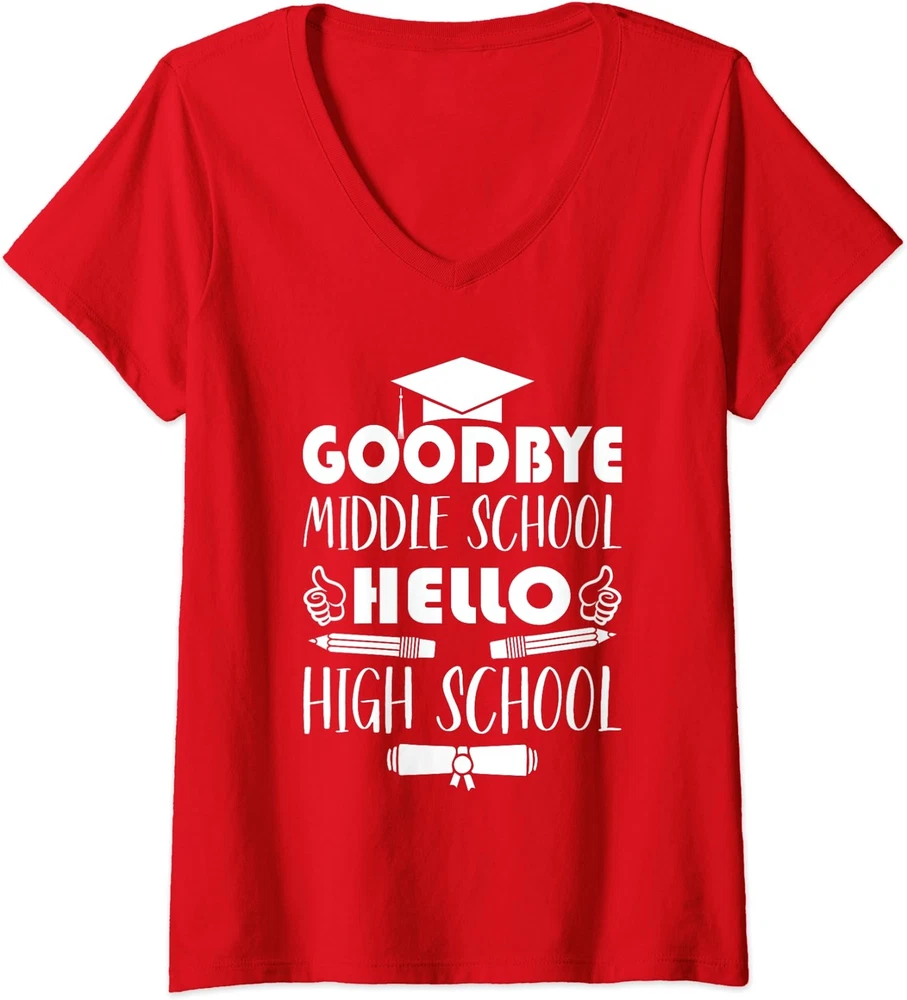 Welcome to Our eBay Shop Fast Shipping Hasslefree Returns Secure Payment Excellent Service Goodbye Middle School Hello High School Teacher Gift Product Description All of our t-shirts are brand new and made to order. They are printed in our New York facilities with love and passion. We use various printing methods to ensure you the high quality, long lasting garments you or your loved ones deserve. We carry sizes from Small to 2X-Large in Ladies' Vneck t-shirts (depending on the design). You can refer to "SPECS & SIZING" to get accurate information regarding the sizes of the garments we use. This design is also available and printed on different types of garments in our store.If you would like this graphic printed on a different type of garment than a short sleeve women's v-neck t shirt, please make sure to check our store ! If you have any questions regarding this item or any other item we have for sale, do not hesitate to contact us. We answer all messages within 1 business day. SPECS & SIZING SHIRT CARE TIPS Wash inside out with cold water with similar colors using a gentle cycle. Tumble dry low or hang-dry Avoid using bleach and do not dry clean. PAYMENT We accept payment by any of the following methods: PayPal Please pay as soon as possible after winning an auction, as that will allow us to post your item to you sooner! SHIPPING Your order will be dispatched within 2 business days of receiving payment (Monday-Friday) with a tracking number. In the very unlikely event that your item is lost or damaged during post, then WE are responsible and will issue either a full refund or replacement. RETURNS If you are not 100% satisfied with your purchase, you can return the product and get a full refund or exchange the product for another one, be it similar or not. You can return a product for up to 14 days from the date you purchased it. Any product you return must be in the same condition you received it and in the original packaging. Please keep the receipt. Feedback * Your great positive feedback will be greatly welcomed! * If you have any problem when you receive the item, please contact us first, we'll do our best to resolve the problem!:) Copyright © 2022 | All Rights Reserved