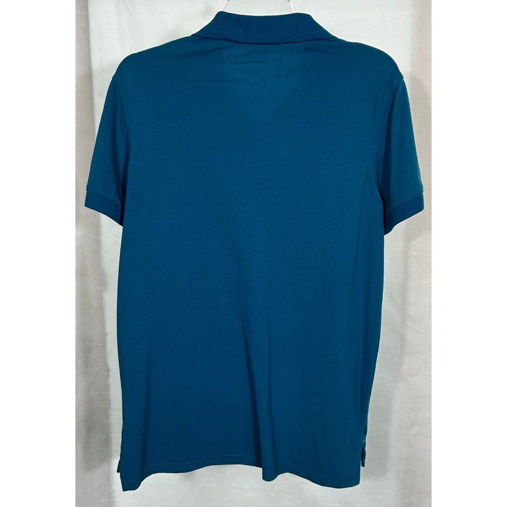 This Goodfellow & Co Loring Polo Shirt in size Medium features a vibrant teal-blue color, short sleeves, and a soft 100% cotton fabric for breathable comfort. Classic polo styling with a two-button placket and banded sleeves makes this a versatile staple for casual or semi-dress occasions. The clean silhouette and modern fit flatter a variety of builds, with measurements approximately 20" pit to pit and 28" shoulder to hem. Made in Indonesia, this polo is part of Goodfellow’s reliable essentials line, favored for everyday wear. Condition: Gently worn with no visible stains or damage. Please note, this item is pre-loved and may have minor imperfections not otherwise noted in the description.