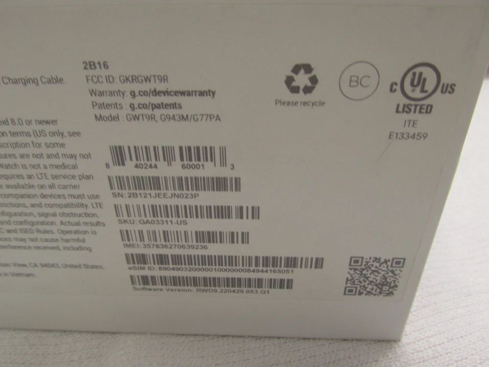 Google Pixel Watch - WIFI + LTE - 41mm - Black Case VERIZON ( GA03311-US ) NEW OPEN PACKAGE Google Pixel Watch, Matte Black case / Obsidian Active band, Verizon Model Name: Pixel Watch Black Serial: 2B121JEEJN023P IMEI: 357836270639236