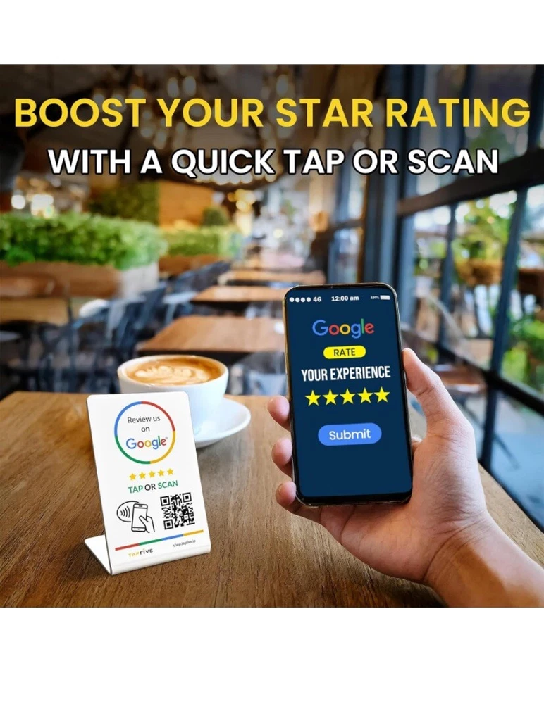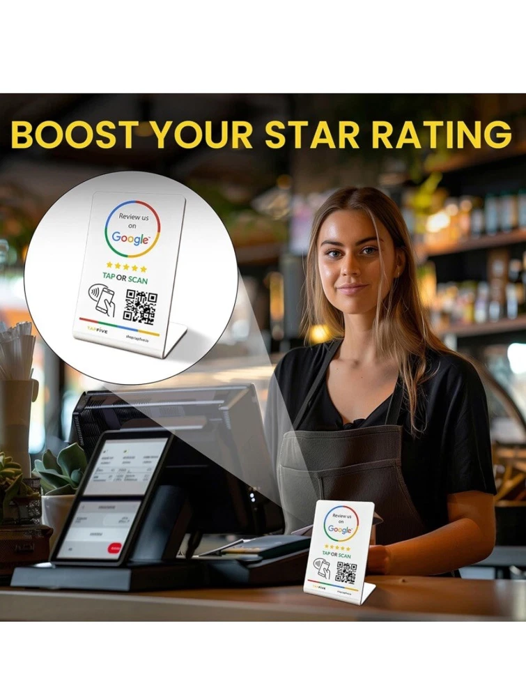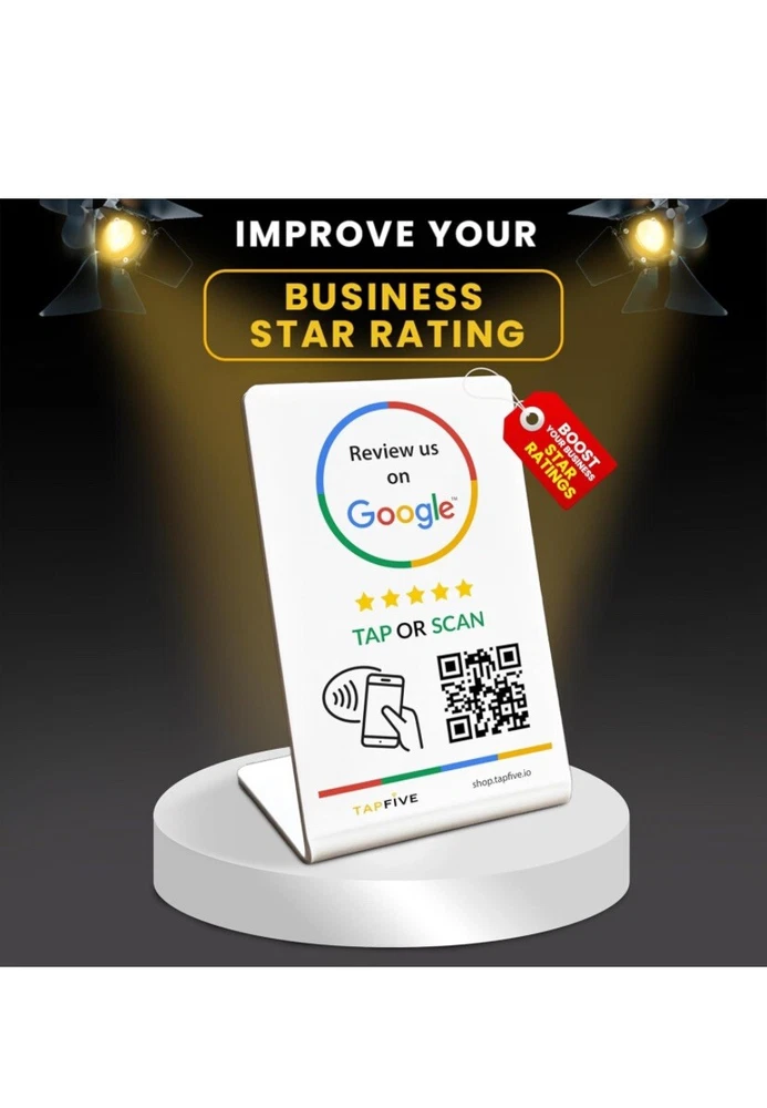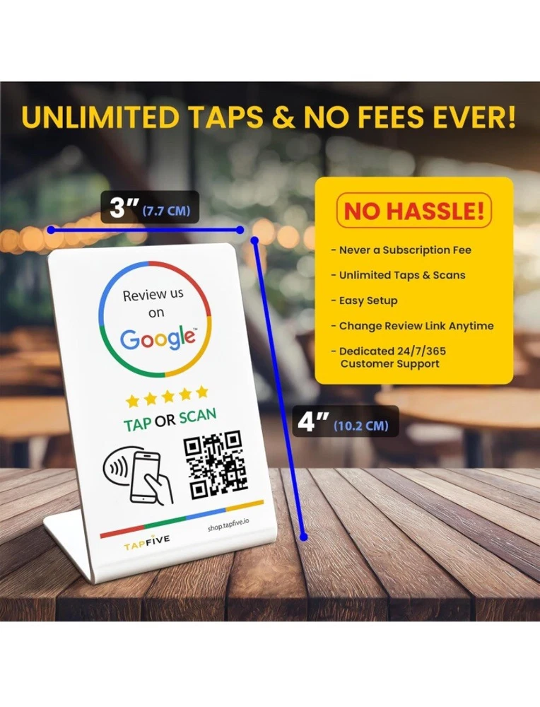 Tap Google Review Stands (3-Pack) by TapFive - Tap for Instant Reviews - All Phones Compatible - Reusable Smart Tap NFC & QR - Boost Business Reviews Zappy Fast - Powered by TapFive (White, 3 Stands) β NO MONTHLY FEES WITH UNLIMITED TAP: Enjoy Free Access! Unlike competitors who charge monthly, TapFive Stars Card monthly access is FREE and NOT a subscription. π GET MORE 5π REVIEWS: Customers can easily access your reviews page by tapping the card and share their positive experience. TapFive Stands are powered by TapSnap technology, a leader in NFC tap tag technology. βΎοΈ UNLIMITED TAP: Includes free unlimited taps and scans! Never worry about your Google review tap stand not working. Unlimited for lifetime! π GET MORE CUSTOMERS: Instant feedback from happy clients means higher SEO and more sales while attract new customers. Our eye-catching stand is perfect for local businesses, stores, restaurants, offices or any type of business looking to improve their online presence. π― EASY SET UP: Setting up our Google Review Tap Stand takes less than 2 minutes. The package includes instructions, and our customer support is always available to help. Manage your Google review stickers through the TapFive platform and modify the link whenever you want. No extra subsciption fees, ever. π LIVE STATISTICS: See live statistics of how many visits and reviews you've received through your TapFive Stand.