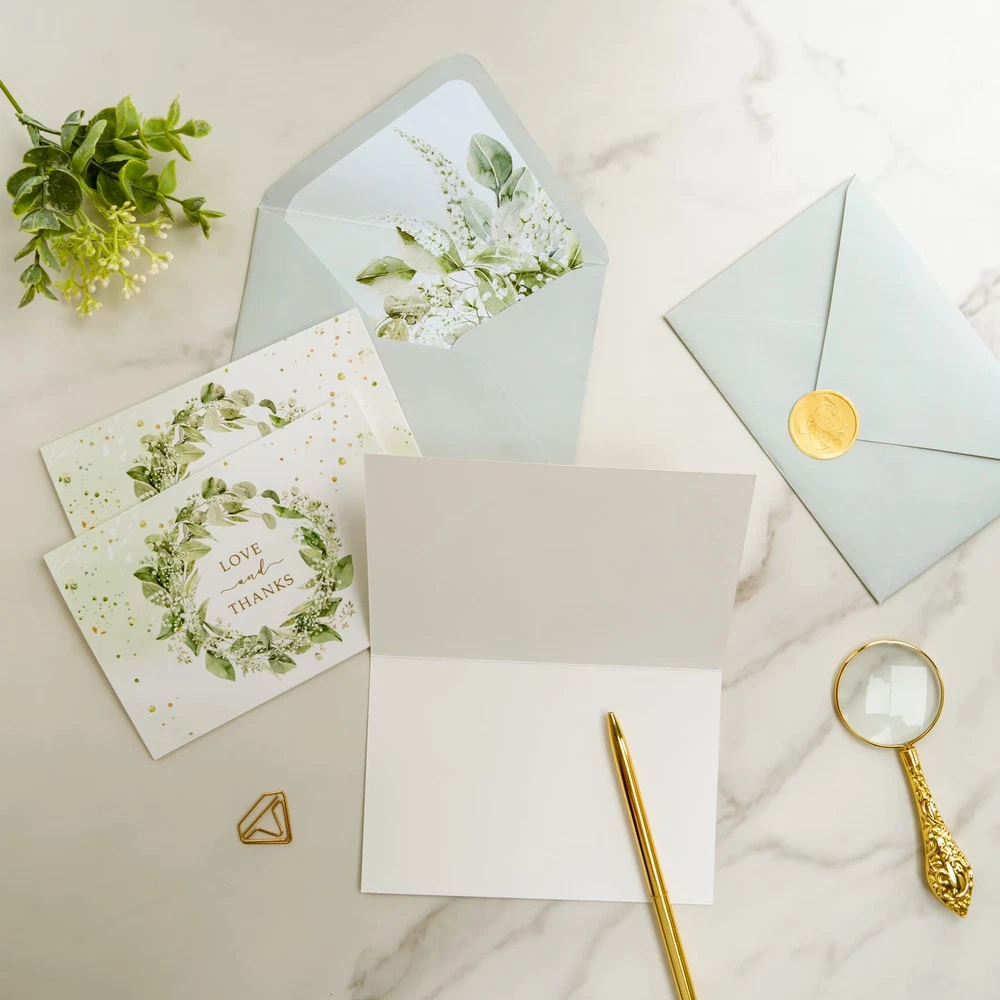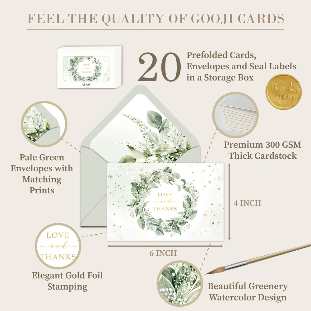Say "thank you" in style with Gooji's top-ranked bulk green thank you cards gold, perfect for all events and occasions, big or small! The bright and vibrant graphics of greenery and botanical floral design make Gooji's elegant thank you notes a standout choice among other Greeting Cards. These high-quality contemporary thank you cards are made with 300 gsm premium cardstock, ensuring your message arrives intact, while also adding a sense of importance to your expression of gratitude. Impress your recipients with the matching printed envelopes, featuring a beautiful printed design inside, adding a touch of polish and sophistication to your Thank You Notes. Whether you need thank-you cards for weddings, businesses, or just everyday use, Gooji's wedding thank you notes with envelopes are a must-have for anyone who appreciates the art of gratitude.