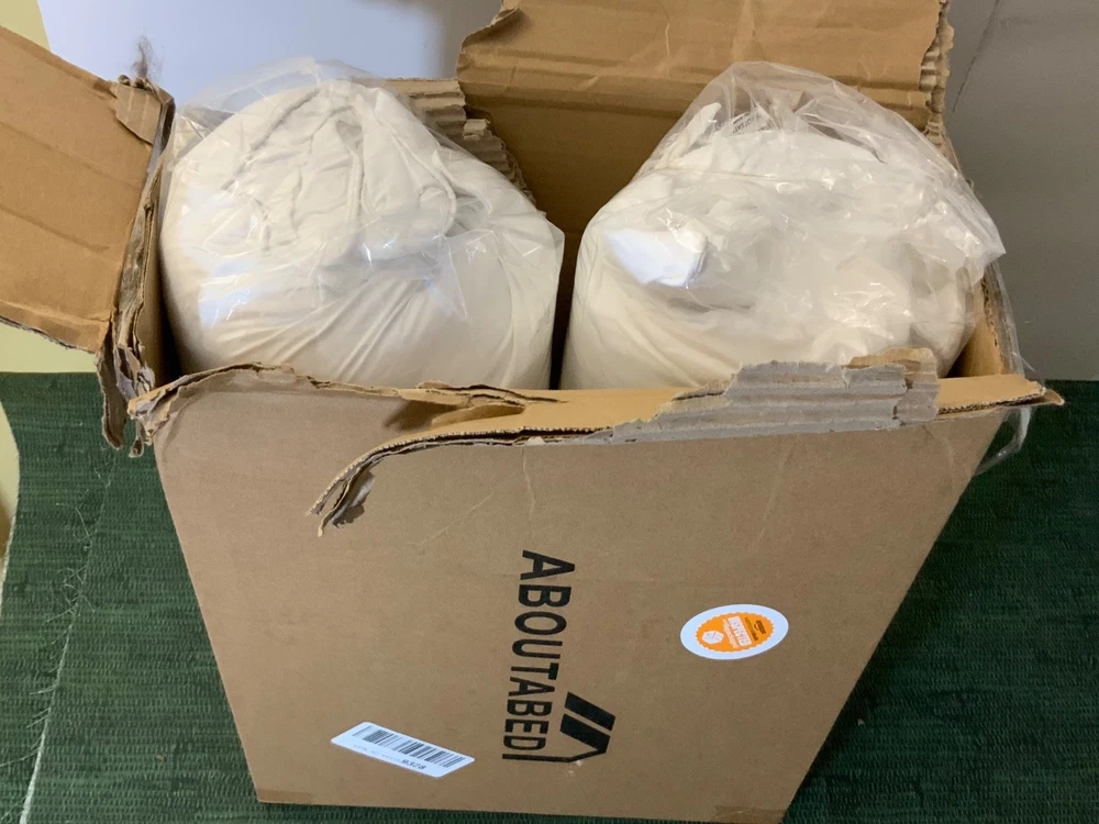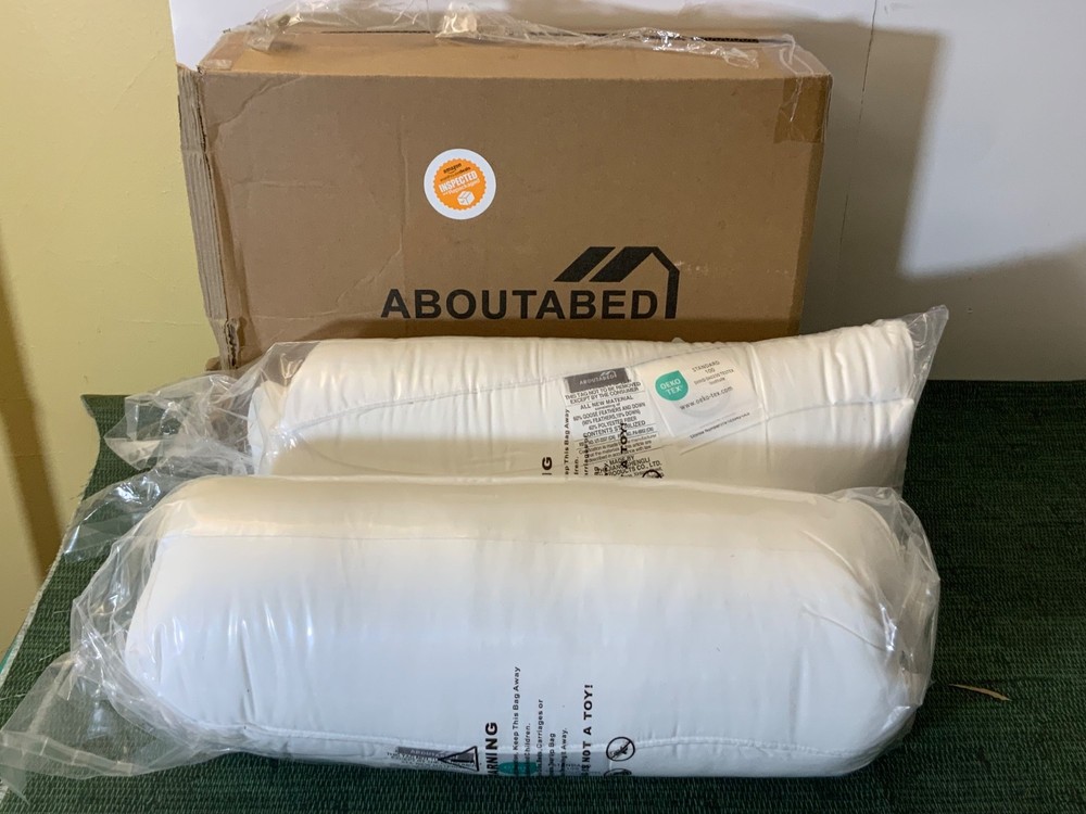 The product is a set of two standard size bed pillows by the brand ABOUTABED. These pillows are filled with a down and feather mix, making them comfortable and supportive for a good night's sleep. The exterior is made of feathers, with a white color that adds a decorative touch to any bedroom. These pillows are perfect for those looking for soft and breathable pillows to enhance their sleep experience. Sealed Pillows / Damaged Box- NEW