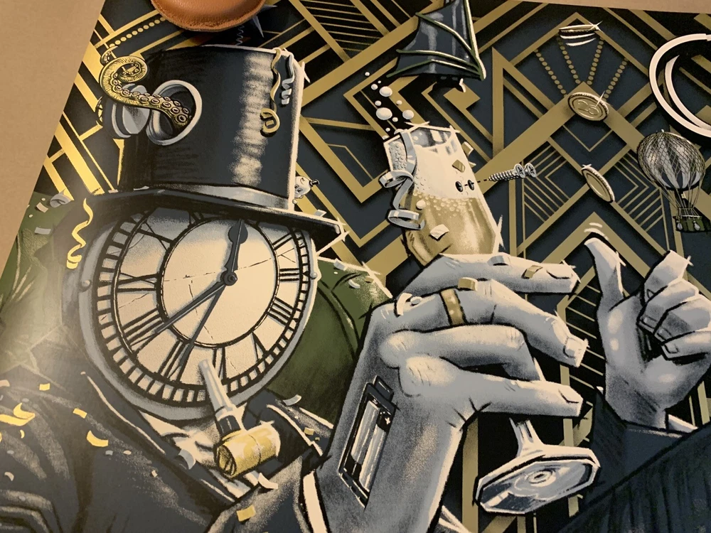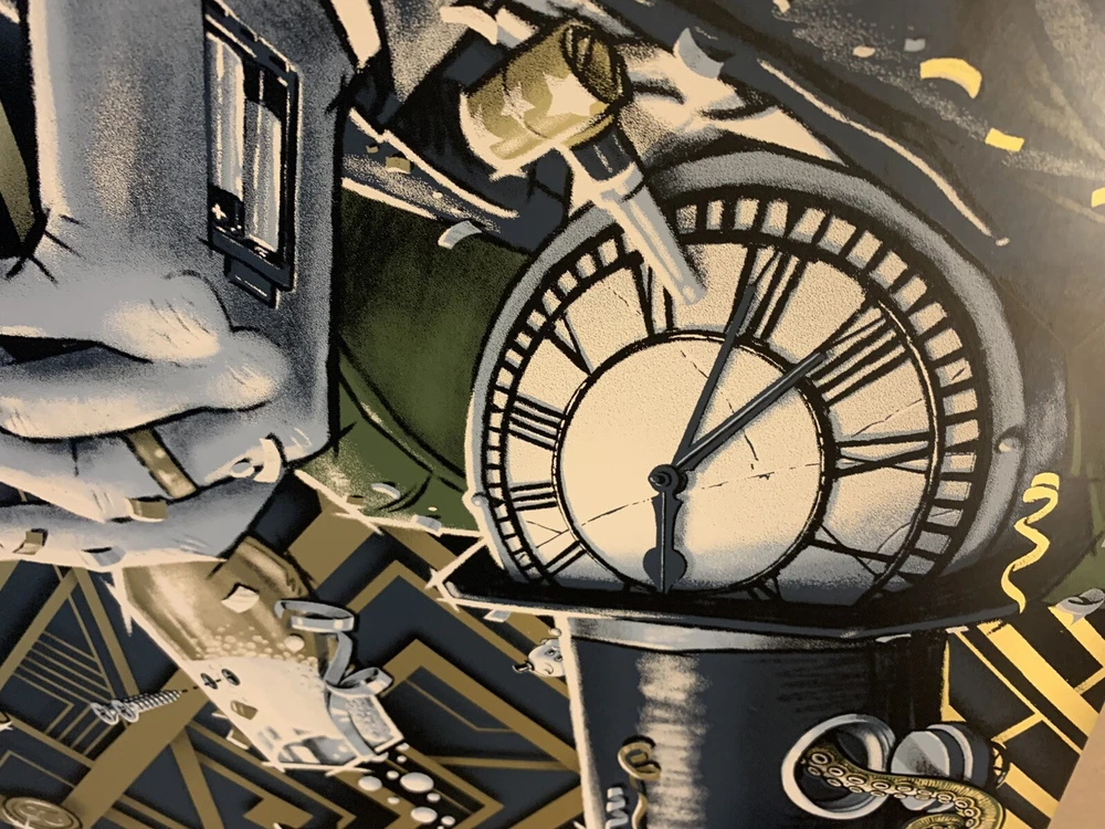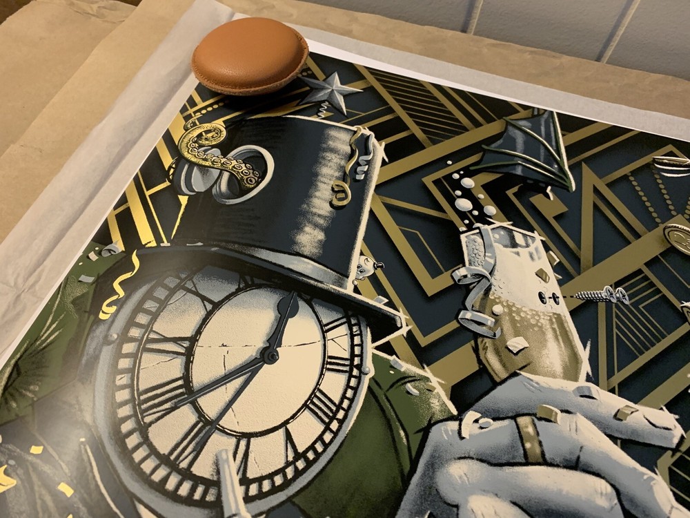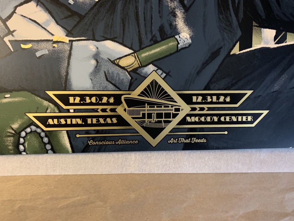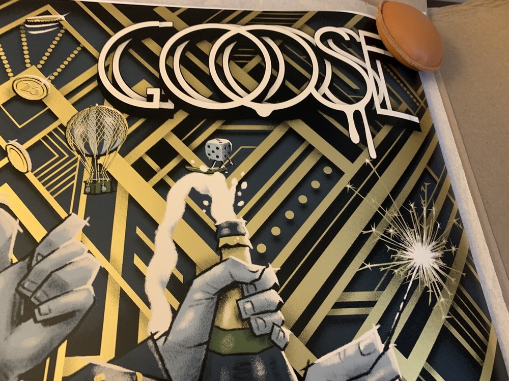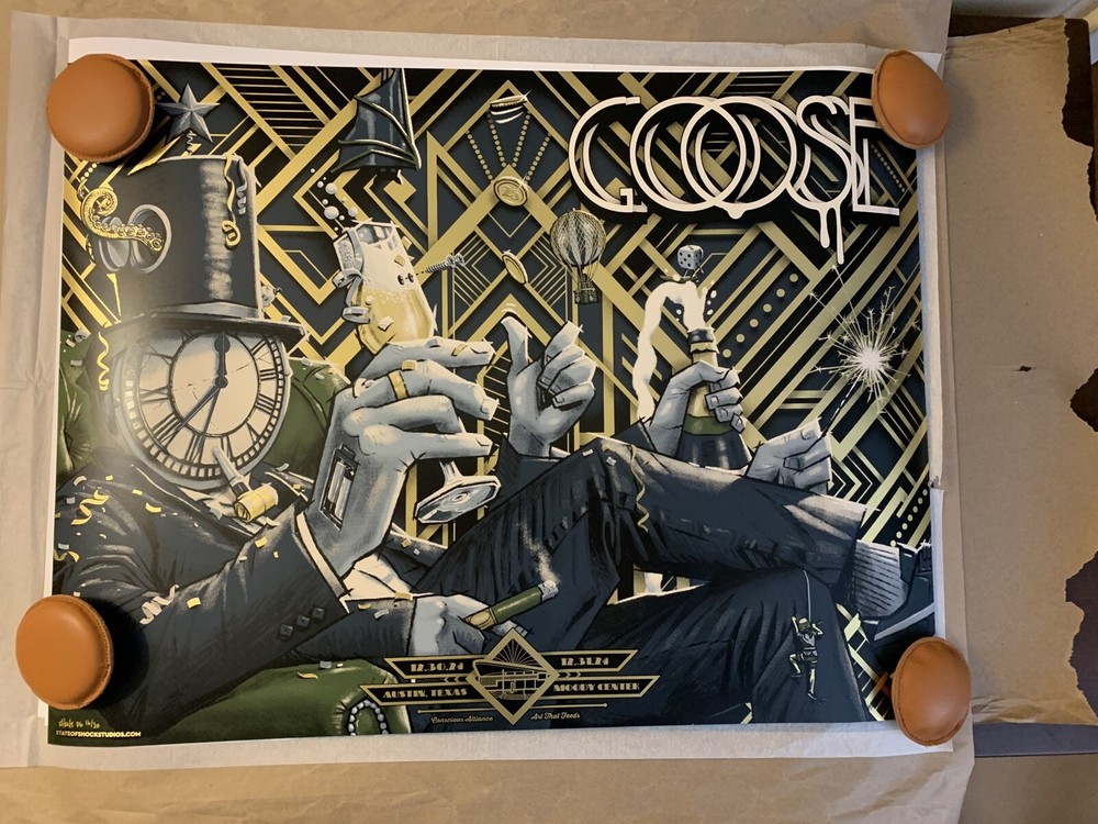 This is a limited edition poster for the Goose New Years show in Austin, TX. The poster features a dull gold foil design and is signed/numbered by the artist, Darin Shock. It is a unique piece of music memorabilia for fans of the band and collectors of entertainment memorabilia.