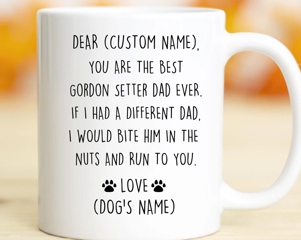 Gordon Castle Setter Dad Birthday Gift Gordon Setter Dad Christmas Gift Gordon Dad Valentine Gift Gordon Dad Appreciation Gordon Dad Mug Product Details.. This high quality 11oz. ceramic white mug has a premium hard coat that provides crisp and vibrant color reproduction sure to last for years. Perfect for all hot & cold beverages. The highest quality printing possible is used. It will never fade no matter how many times you wash it. Material: 100% Ceramic. Print both sides. Dishwasher and Microwave Safe. High Gloss + Premium White Finish. Printed in the U.S.A. Personalized & Custom. We support personalized and custom mug to add custom, when placing an order, you can add notes to the "order note" in shipping address section. Also you can contact us directly via message. Shipping Info. Ready to ship in 1 to 2 business days, All products are made-to-order and proudly printed in the United States. Shipped by USPS and DHL, You will receive your order in 5-7 days. Replace & Refund. All products are defective during shipping broken, chipped will be replaced free of charge. You are not satisfied with the product, we will refund 100% money to you. If any other issues arise, please do not hesitate to message, we would be more than happy to assist you.