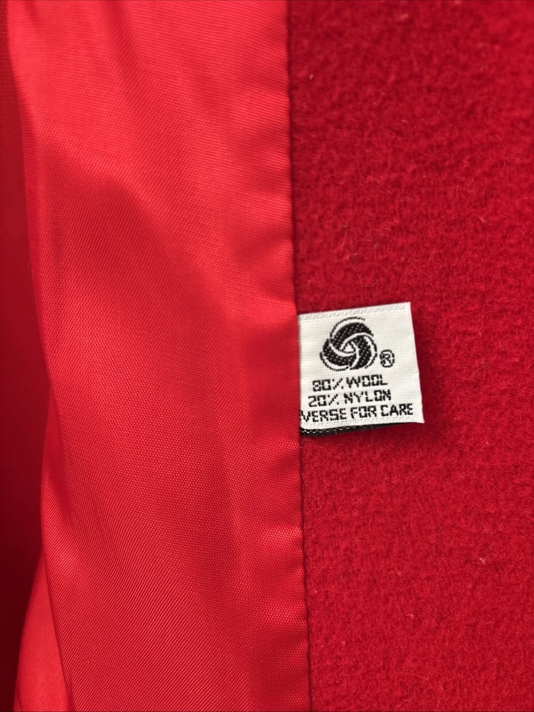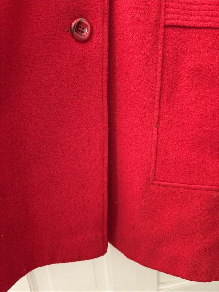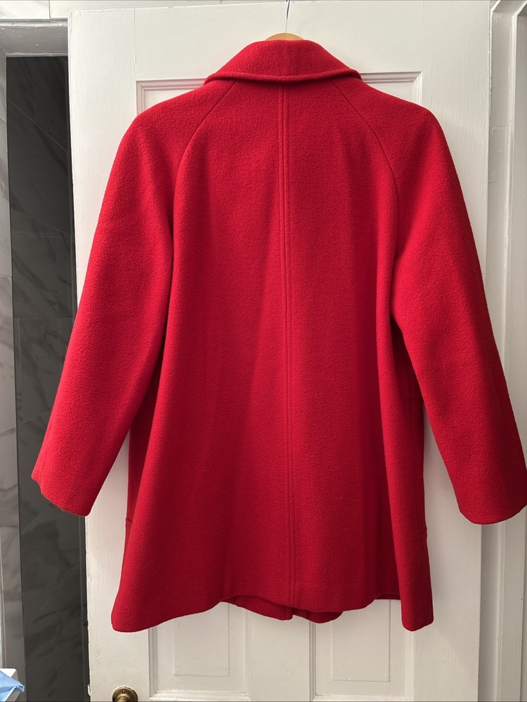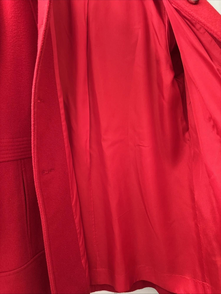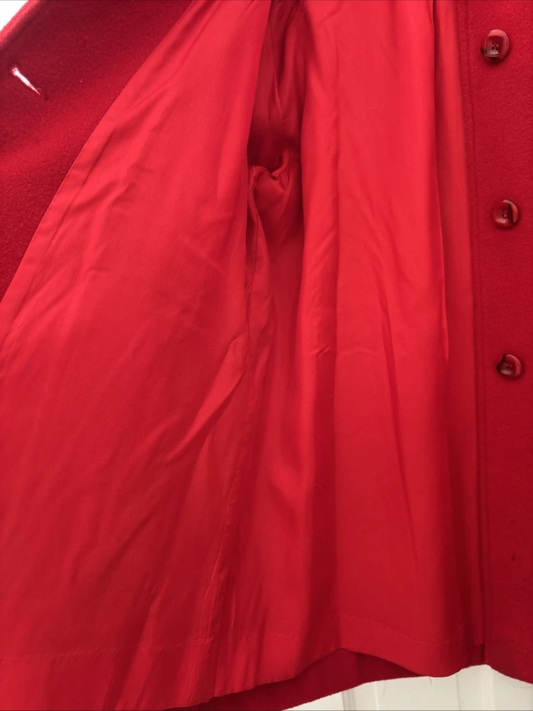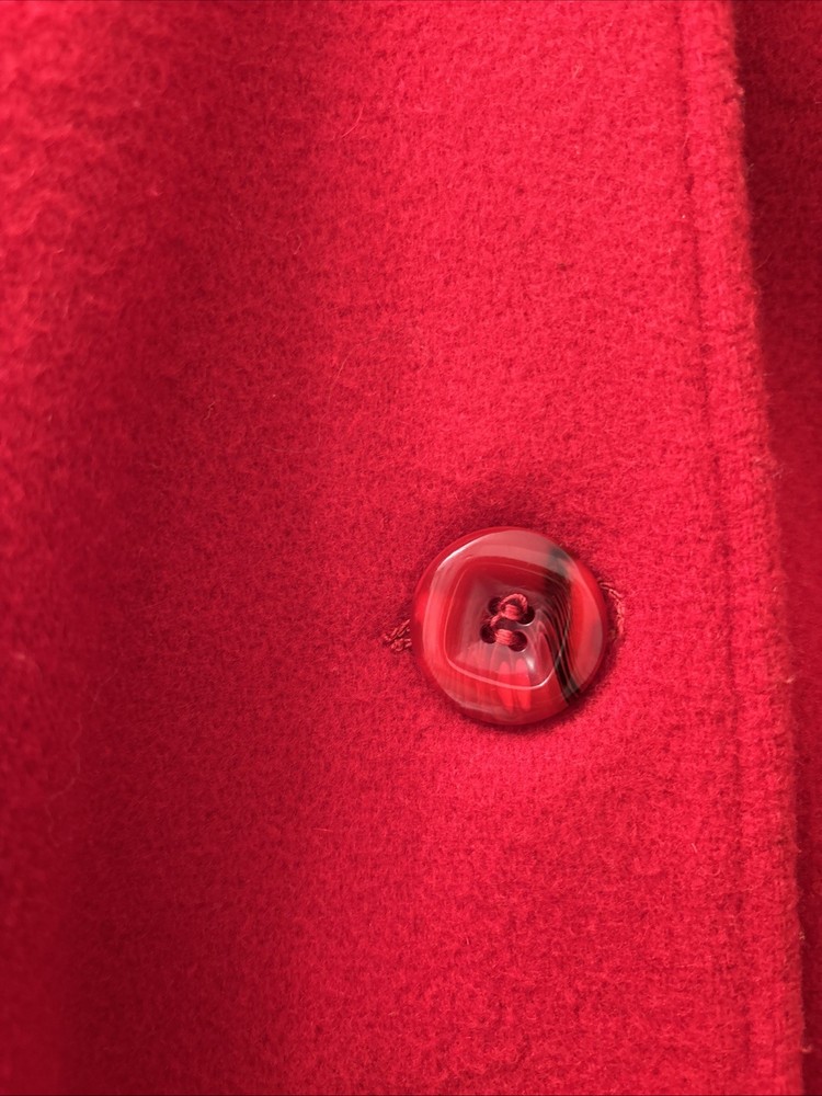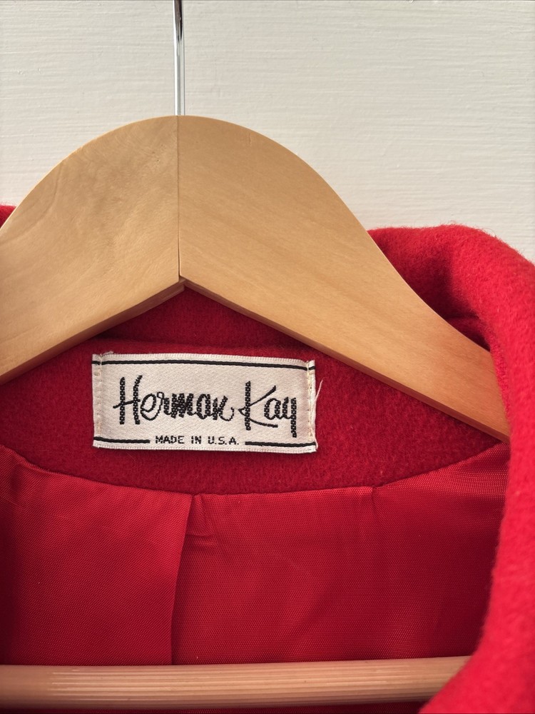 Perfect coat for Valentine’s Day! ❤️ Add a pop of color to your wardrobe with this striking vintage Herman Kay coat. Known for high-quality American-made outerwear, this piece features a rich cherry-red hue and a sophisticated, structured fit. Brand: Herman Kay. Material: Premium 80% Wool / 20% Nylon blend for superior warmth and durability. Lining: Fully lined with a smooth acetate finish fabric for easy layering. Lining is pristine. Classic button-front closure-gorgeous buttons and cherry red color! Functional side pockets. Proudly made in the USA. Condition: Very good vintage condition; please note the small marks on the bottom front of coat. Some minor pilling as reflected in photos. Jacket lining is pristine! Length: 32 Pit to pit: 19 Sleeve: 24 From a smoke-free home. I am happy to answer any questions you may have in a consider all of reasonable offers! Thank you for looking!