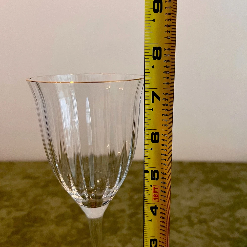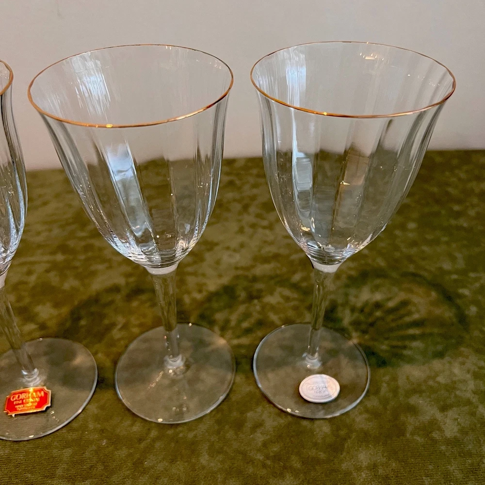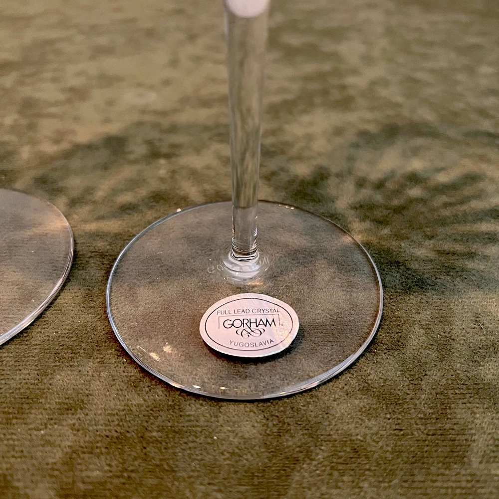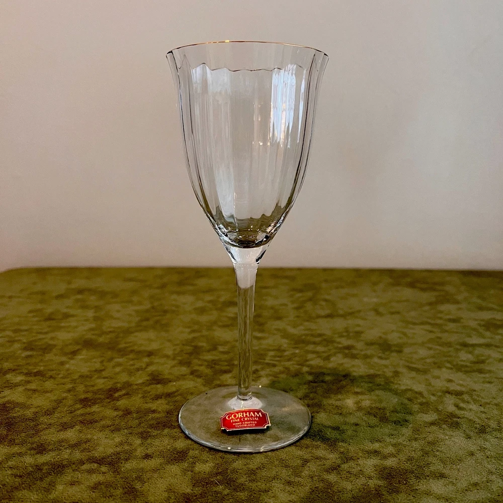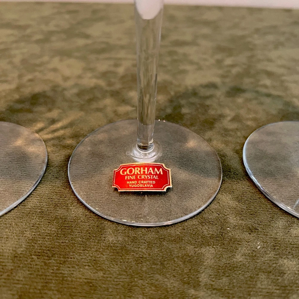 This vintage set of four Gorham Laurin crystal wine glasses is elegantly designed with a gold rim and ribbed backstamp. Handmade in Yugoslavia in 1982, each round wine glass stands at 7 1/4 inches tall with a 3-inch diameter. The contemporary style and glossy finish make them suitable for all occasions, while the "Laurin" pattern adds a touch of sophistication. Care instructions recommend hand washing only, and the glasses are crafted with high-quality crystal. Perfect for wine lovers, this set showcases a unique blend of elegance and craftsmanship from the 1980s.