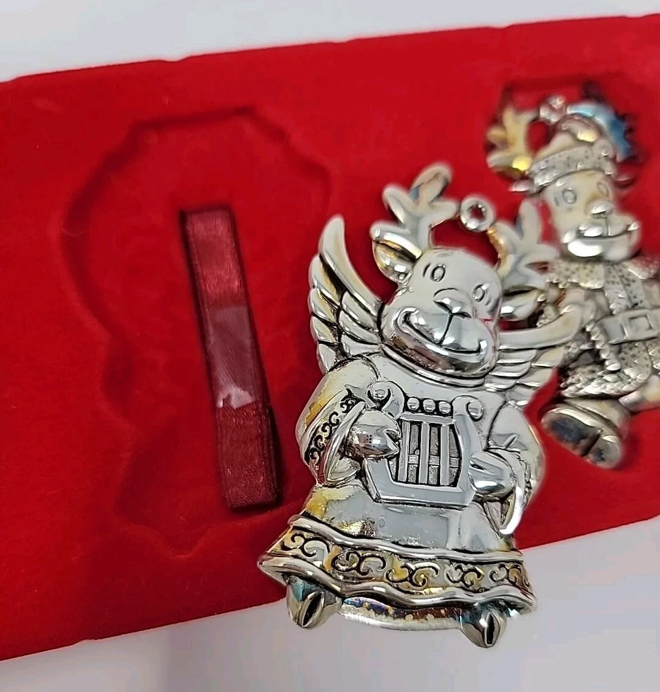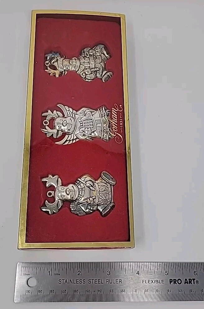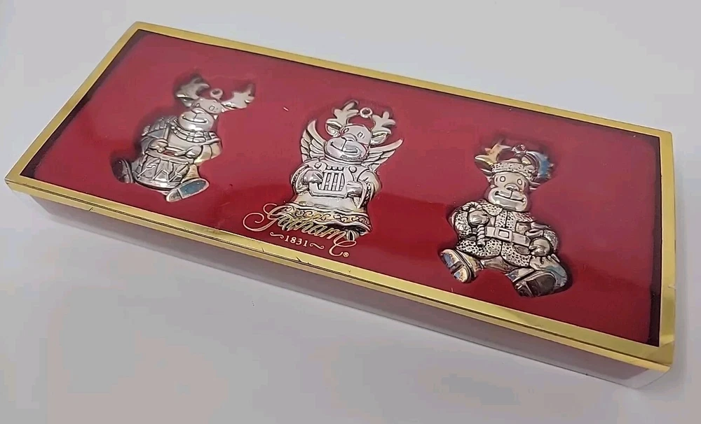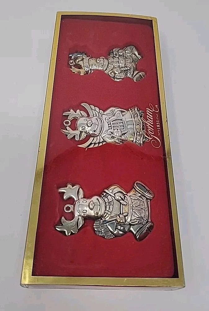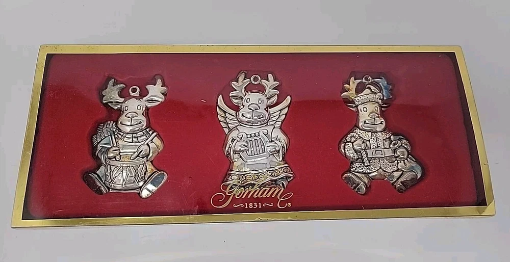 Add a touch of vintage charm to your Christmas decor with this set of three Gorham silver-plated reindeer ornaments. The medium-sized ornaments feature a mid-century modern style and are perfect for any Christmas occasion. Each ornament is an original piece from the Gorham Ornaments collection and is made of high-quality silver-plated material. Celebrate the holiday season with these beautiful and unique ornaments that are sure to impress your guests. The reindeer shape and silver color make them a perfect addition to any Christmas tree. Get into the festive spirit with these timeless and elegant pieces from Gorham.