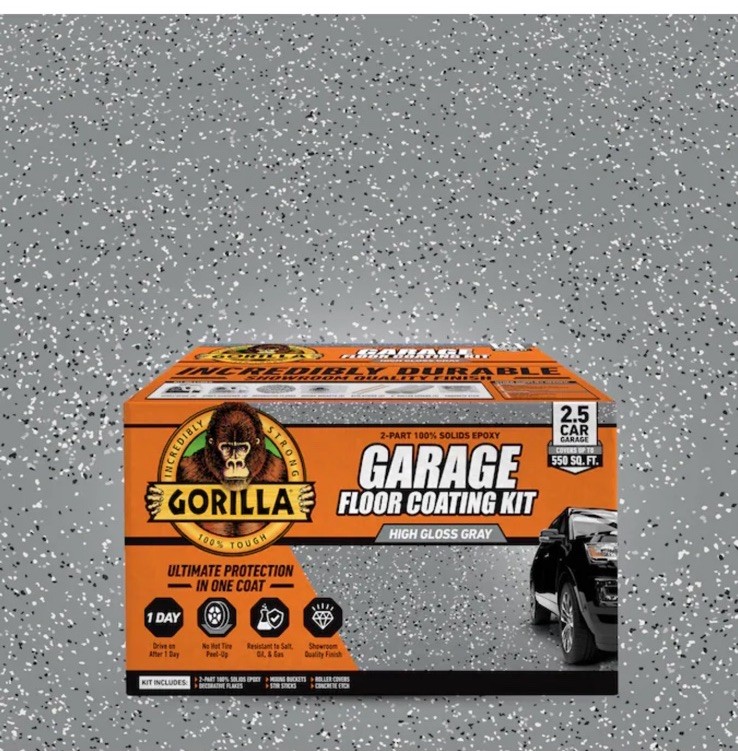 Gorilla Epoxy Garage Floor Coating (12 pc) Kit, 2.5-Car, Concrete Flooring, 100% Solids, Superior Adhesion, Incredibly Durable High Gloss Gray Finish, 550 sq. ft. Coverage This item is brand new and sealed. Originally $430 plus taxes.