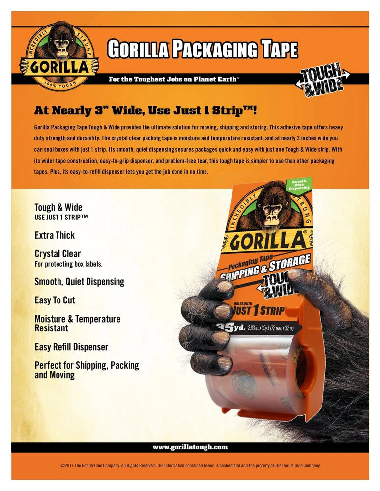 Product Description Gorilla Shipping Tape is thicker, tougher and wider! Keeping packages secure now takes JUST ONE STRIP! The smooth, quiet, ultra thick tape is easy to cut and apply and holds for as long as needed. From the Manufacturer Gorilla Shipping Tape is thicker, tougher and wider! Keeping packages secure now takes JUST ONE STRIP! The smooth, quiet, ultra thick tape is easy to cut and apply, and holds for as long as needed. Thicker, Tougher, Wider Packaging Tape A tough tape that holds with Just 1 Strip; Gorilla Packaging Tape is perfect for shipping, moving and storage Thick 3.4 mil. Tape construction Crystal clear for protecting box labels Easy to cut Thicker, Tougher, Wider Packaging Tape A tough tape that holds with Just 1 Strip; Gorilla Packaging Tape is perfect for shipping, moving and storage Thick 3.4 mil. Tape construction Crystal clear for protecting box labels Easy to cut