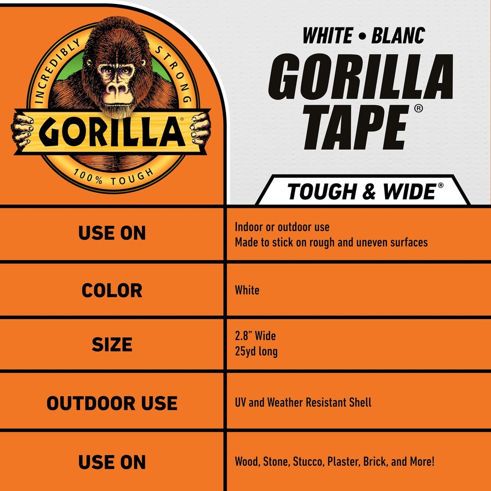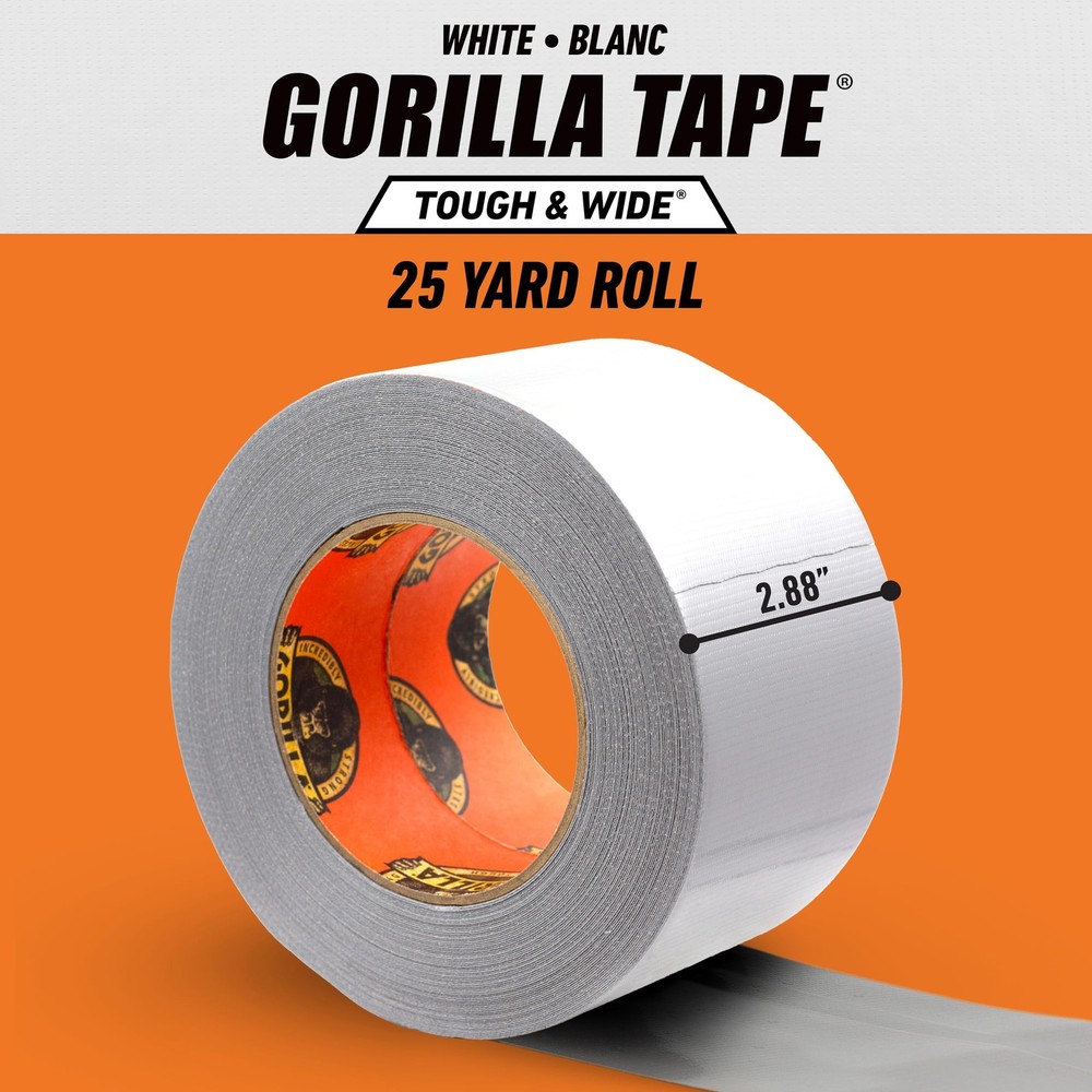 Gorilla Tape Tough and Wide, White Tape, 2.88" x 25 yd (Pack of 1) - Heavy Du