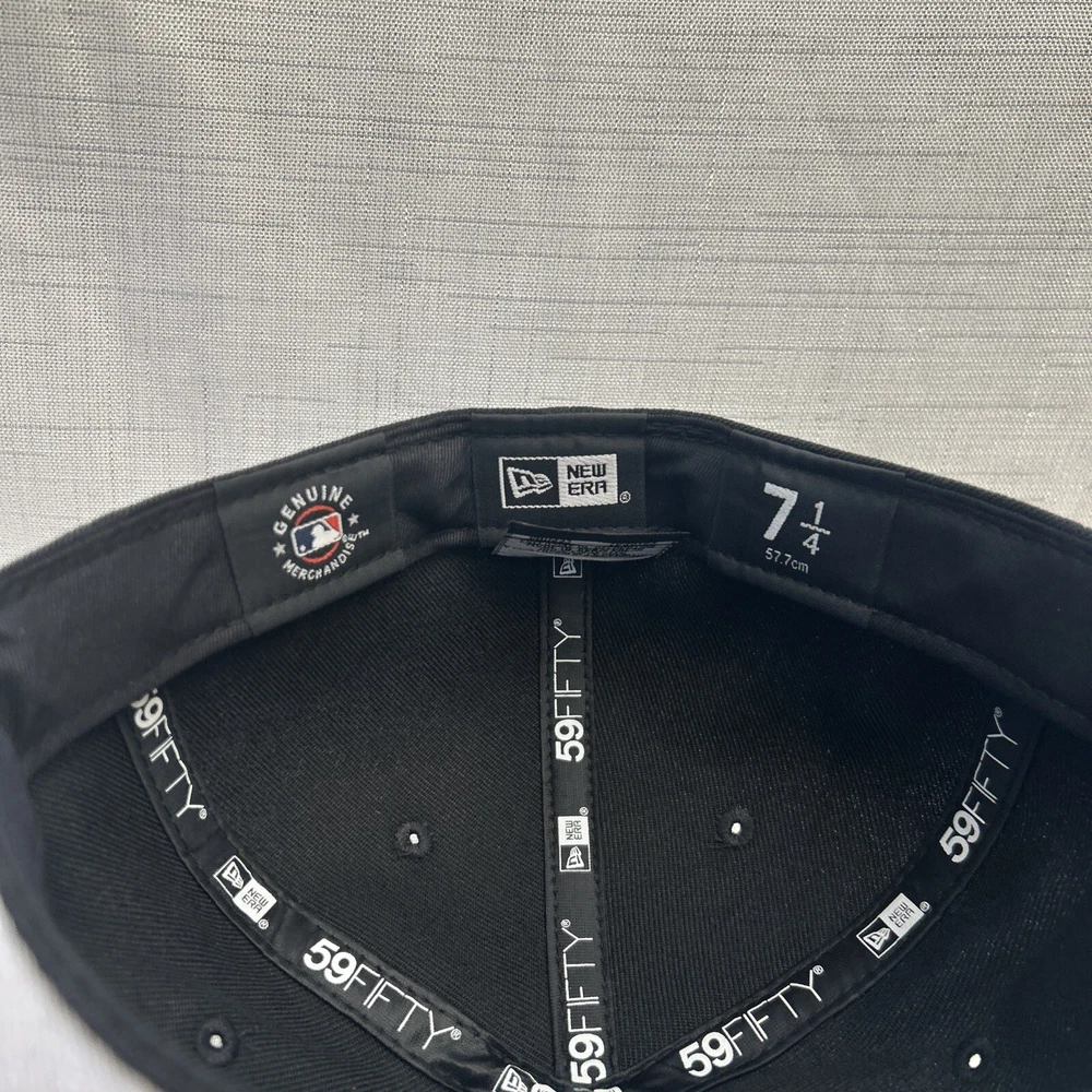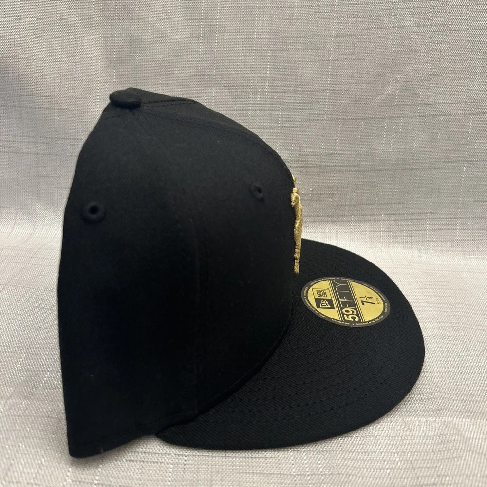 This is a New Era 59Fifty baseball cap featuring the New York Mets team in black and gold colors. It is made of polyester canvas material in a size 7 1/4. The cap is part of the MLB collection and suitable for unisex adults. It can be worn casually throughout all seasons and is not personalized or handmade.