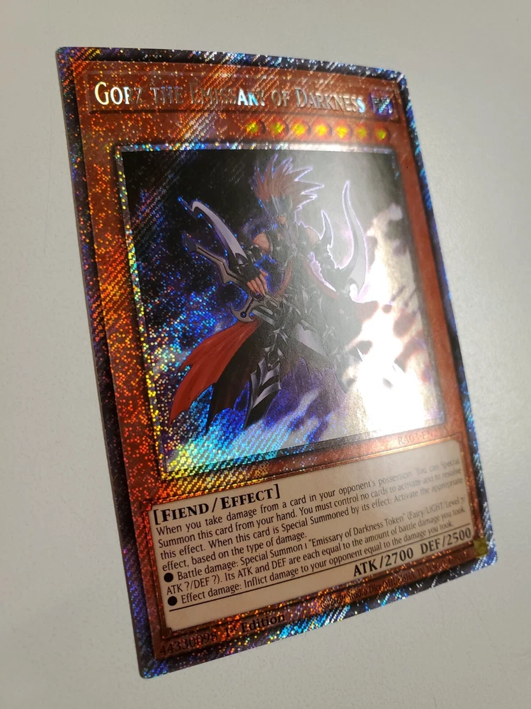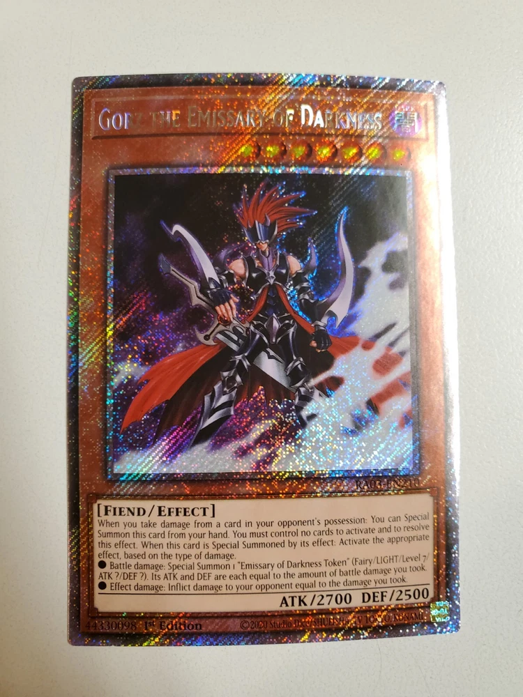 Features:1st EditionAttribute/MTG:Color:DarkCard Number:RA03-EN210Attack/Power:2700Manufacturer:KonamiCard Type:EffectCard Name:Gorz the Emissary of DarknessSet:Quarter Century BonanzaAdditional Description:Gorz the Emissary of Darkness (Platinum Secret Rare)Level:7Defense/Toughness:2500Card Text:When you take damage from a card in your opponent's possession: You can Special Summon this card from your hand. You must control no cards to activate and to resolve this effect. When this card is Special Summoned by its effect: Activate the appropriate effect, based on the type of damage.• Battle damage: Special Summon 1 "Emissary of Darkness Token" (Fairy/LIGHT/Level 7/ATK ?/DEF ?). Its ATK and DEF are each equal to the amount of battle damage you took.• Effect damage: Inflict damage to your opponent equal to the damage you took.Language:EnglishGame:Yu-Gi-Oh! TCGCreature/Monster Type:FiendRarity:Platinum Secret Rarebrand:Konami