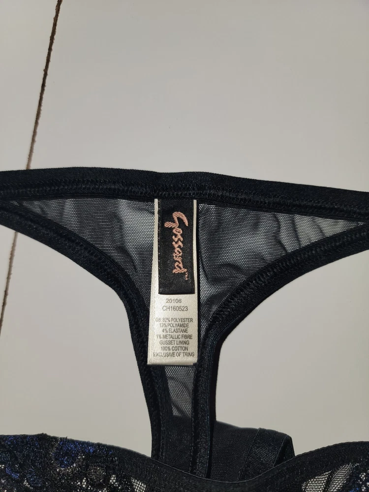 The Gossard VIP Rapture thong in size large features a semi-sheer floral lace design in black. Made of polyester, elastane, metallic fiber, polyamide, and cotton, this thong has a stylish thong/string style. Perfect for women looking for a sexy and comfortable underwear option.
