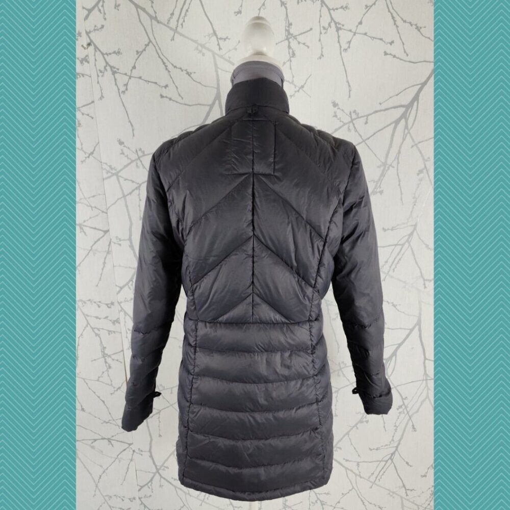 Gotcha Glacier Gray Down Filled Full Zip Midi Puffer Jacket reversible but it looks like the same on the other side and the tags will have to be removed Women's L Chest: 20" Length: 32" Good used condition: no rips, marks or stains.