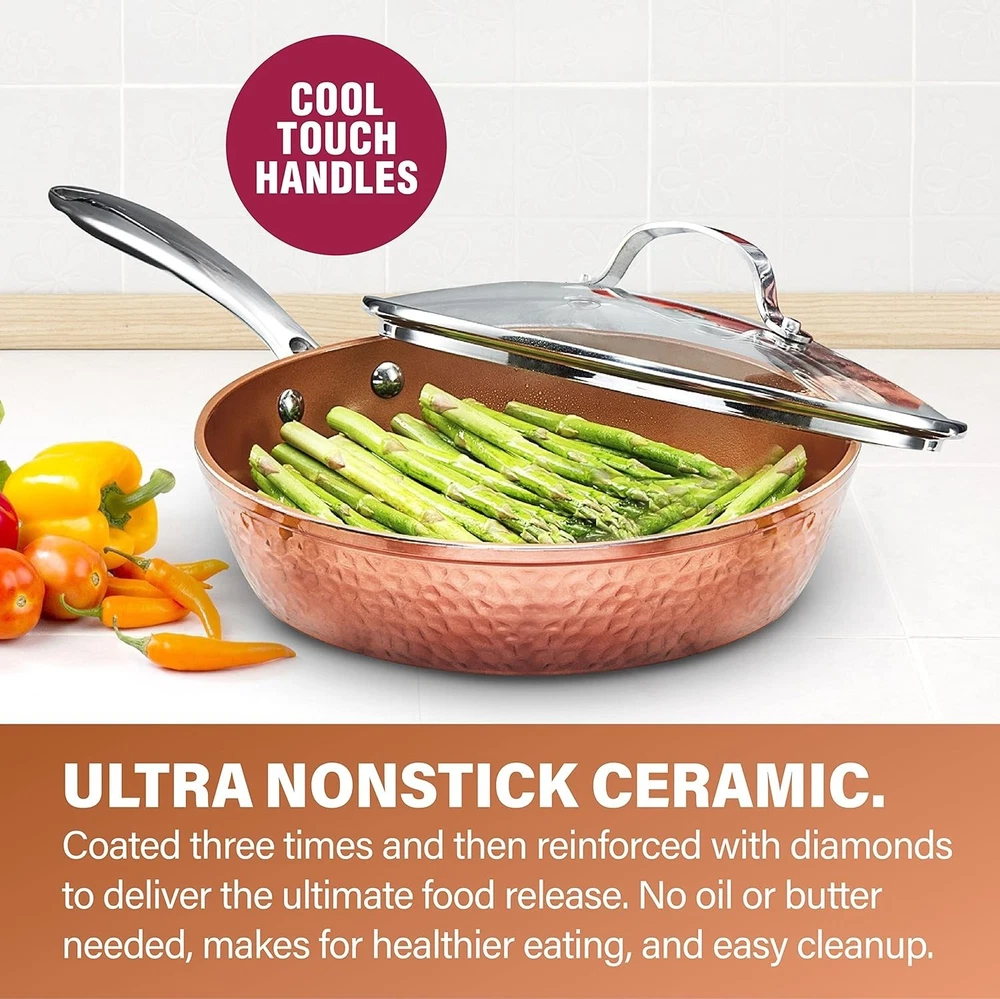Gotham Steel Hammered 9.5 Inch, Non-Stick Frying Pan with Lid, Ceramic Cookware From the brand About this item ELEGANT YET PRACTICAL – the Gotham Steel hammered collection is beautiful and makes a statement in every kitchen, yet nonstick, lightweight, scratch resistant and dishwasher safe! NON-STICK AND OIL FREE PAN: Nothing sticks - even eggs and meat comes right off because of the special Ti-Cerama coating on our pan. And since no oil is needed, you can prepare healthy dishes for you and your family. INDUCTION CAPABLE – these pots and pans are suitable for all stovetops, including induction (the baking trays aren’t induction capable EVENLY-COOKED MEAL The Gotham Steel Hammered pan is constructed with solid, high heat conductivity aluminum material that allows for even surface heating, allowing you to cook even thicker steaks cuts to perfection! DISHWASHER-and OVEN-SAFE PAN Our pan is oven-safe up to 500 degrees Fahrenheit – so not only can you prepare stove stop meals, you can even bake using this frying pan. Clean up will be a breeze, just stick it in the dishwasher and you’re set! Product Description Shipping We offer FREE shipping on all orders! We ship within Three business days of payment, usually sooner. We use a selection of shipping services such as UPS, FedEx, USPS etc. We only ship to the lower 48 states, no APO/FPO addresses or PO Boxes allowed. Local pickups and combined shipping options are not provided at this time. Return You can return a product for up to 30 days from the date you purchased it. Any product you return must be in the same condition you received it and in the original packaging. Please keep the receipt. Payment We accept payment by any of the following methods: PayPal Please pay as soon as possible after winning an auction, as that will allow us to post your item to you sooner! Feedback Customer satisfaction is very important to us. If you have any problem with your order, please contact us and we will do our best to make you satisfied. Contact Us If you have any queries, please contact us via ebay. We usually respond within 24 hours on weekdays. Please visit our eBay store to check out other items for sale! Thank you for shopping at our store.