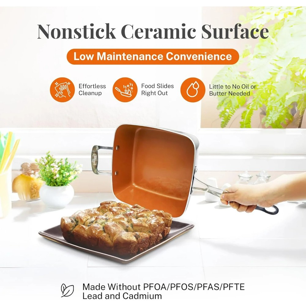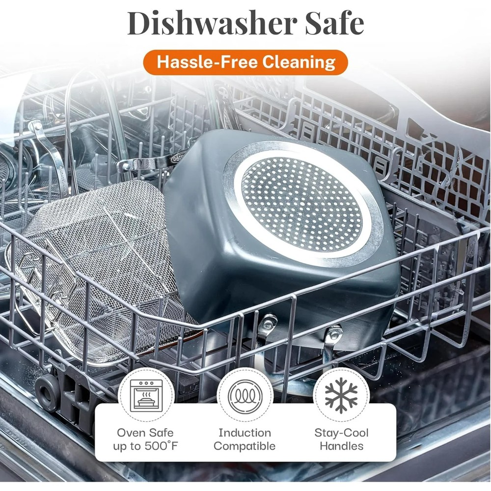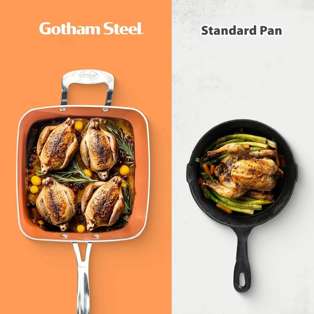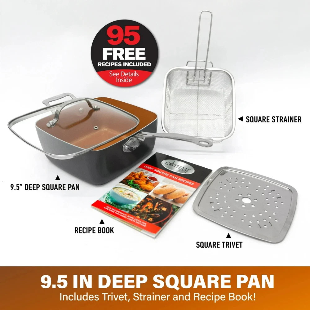 Gotham Steel Nonstick Deep Fry Pan 9.5" Square Ceramic Frying Pan Pot with Glass Lid 5.6 Quart with Basket Steamer Insert About this item Product details Enhance your cooking with the Gotham Steel 9.5" Deep Fry Pan Set, a must-have for any kitchen, offering versatility and ease of use. This 5.6-quart square pan is equipped with a ceramic-coated nonstick surface, allowing food to release effortlessly without the need for butter or oil, promoting healthier meals. Ideal for frying, steaming, baking, roasting, and more, this set includes a tempered glass lid, deep fry basket, and steamer tray, making it a perfect all-in-one solution for preparing your favorite dishes. The stainless steel induction bottom ensures even heat distribution and compatibility with all stovetops, including induction. Designed for durability, this pan can handle high heat and is dishwasher safe, making cleanup quick and easy. Experience efficient and healthy cooking with this premium deep fry pan set. 5.6 Quart Deep Fry Pan: Includes 9.5" square deep pan tempered glass lid deep fry basket steamer tray/trivet Versatile Cookware Set: Ideal for frying, steaming, baking, roasting, and boiling, this 9.5" square deep pan is perfect for a variety of cooking tasks. Ultra-Nonstick Ceramic Coating: The triple-layer ceramic surface ensures easy food release with less oil or butter, supporting healthier meal preparation. Safe Cooking Experience: Made without PTFE, PFOA, and PFOS, the ceramic coating ensures safe, non-toxic cooking without the release of harmful chemicals. Induction Ready & Even Heating: Equipped with a stainless steel induction bottom for fast and even heat distribution, compatible with all stovetops, including induction. Durable & Long-Lasting Design: Reinforced with titanium, this pan resists scratches and warping, retaining its nonstick properties even with daily use. Easy Cleanup: Dishwasher-safe for added convenience, this pan allows for quick and effortless cleaning, letting you focus on enjoying your meals. High-Heat Resistant: This pan withstands high temperatures, making it perfect for searing meats or cooking acidic dishes without altering flavors. High-Heat Resistant: This pan withstands high temperatures, making it perfect for searing meats or cooking acidic dishes without altering flavors.