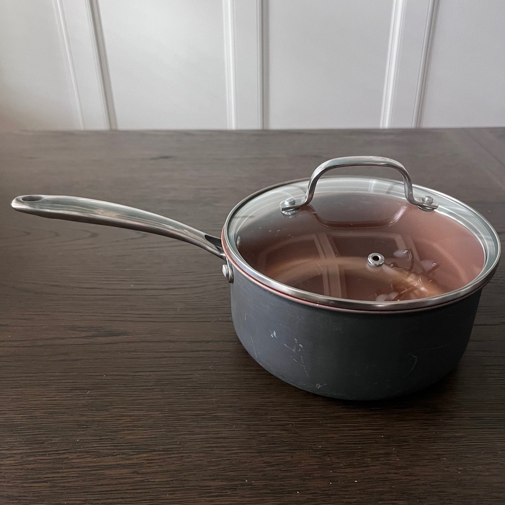 Gotham Steel Pro hard-anodized saucepan delivers professional-grade performance with a durable nonstick ceramic copper interior. This versatile kitchen essential includes a tempered glass lid with a steam vent, allowing for easy monitoring of contents while cooking. The stay-cool stainless steel handle is ergonomically designed for a secure grip, and the heavy-duty construction ensures even heat distribution for consistent results. Ideal for simmering sauces, boiling grains, or reheating soups, this pan combines a sleek charcoal grey exterior with a high-performance cooking surface. Measurements: Diameter (Size): 8.5 in (Measured across the top rim from edge to edge) Depth (Capacity): 4 in (Measured from the bottom interior surface straight to the top rim) Keywords: Ceramic Cookware, Nonstick Pot, Copper Interior, Hard Anodized, Kitchen Essential, Saucepan with Lid, Induction Compatible, PFOA Free, Healthy Cooking, Professional Grade, Culinary, Home Chef, Grey Cookware, Tempered Glass Lid, Even Heating Check out my store for other great finds. See my other listings!