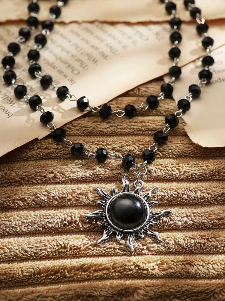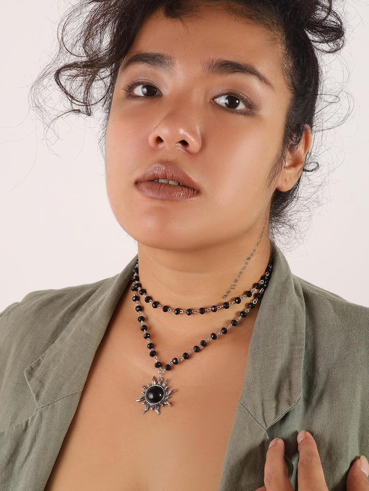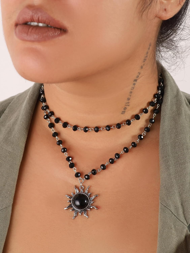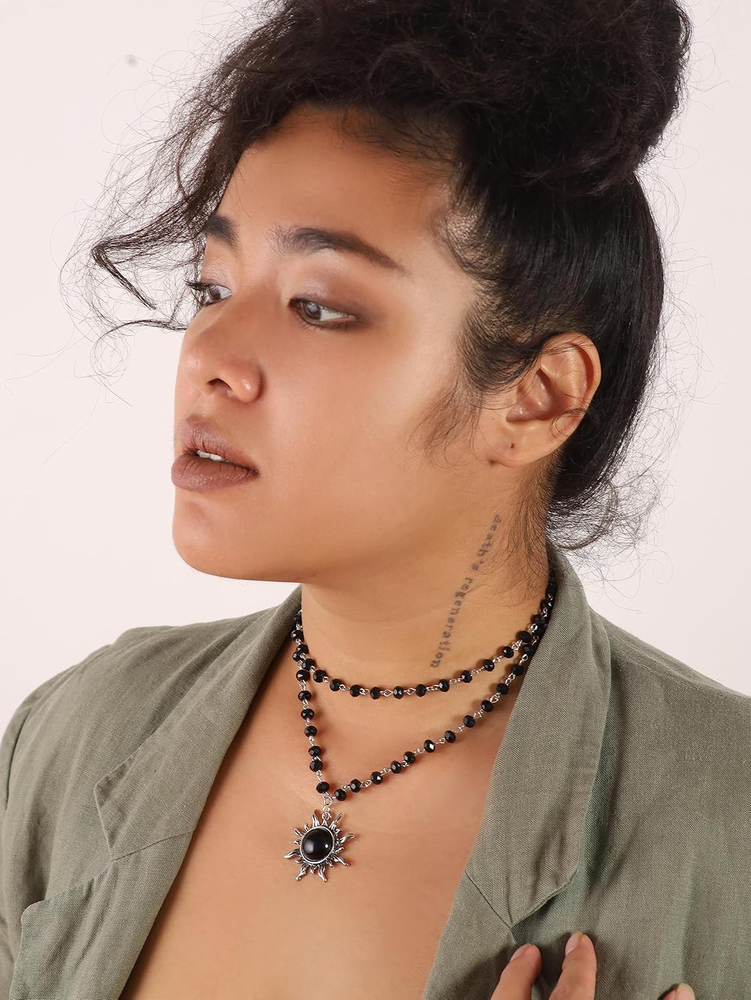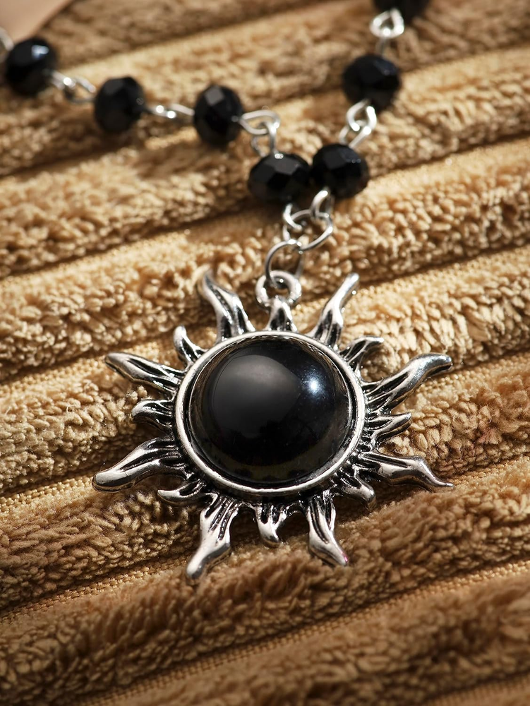 HomeGothic Black Sun Necklace with Black Sun Crystal Pendant and Bead Choker for Men and Women, Dark Aesthetic Jewelry