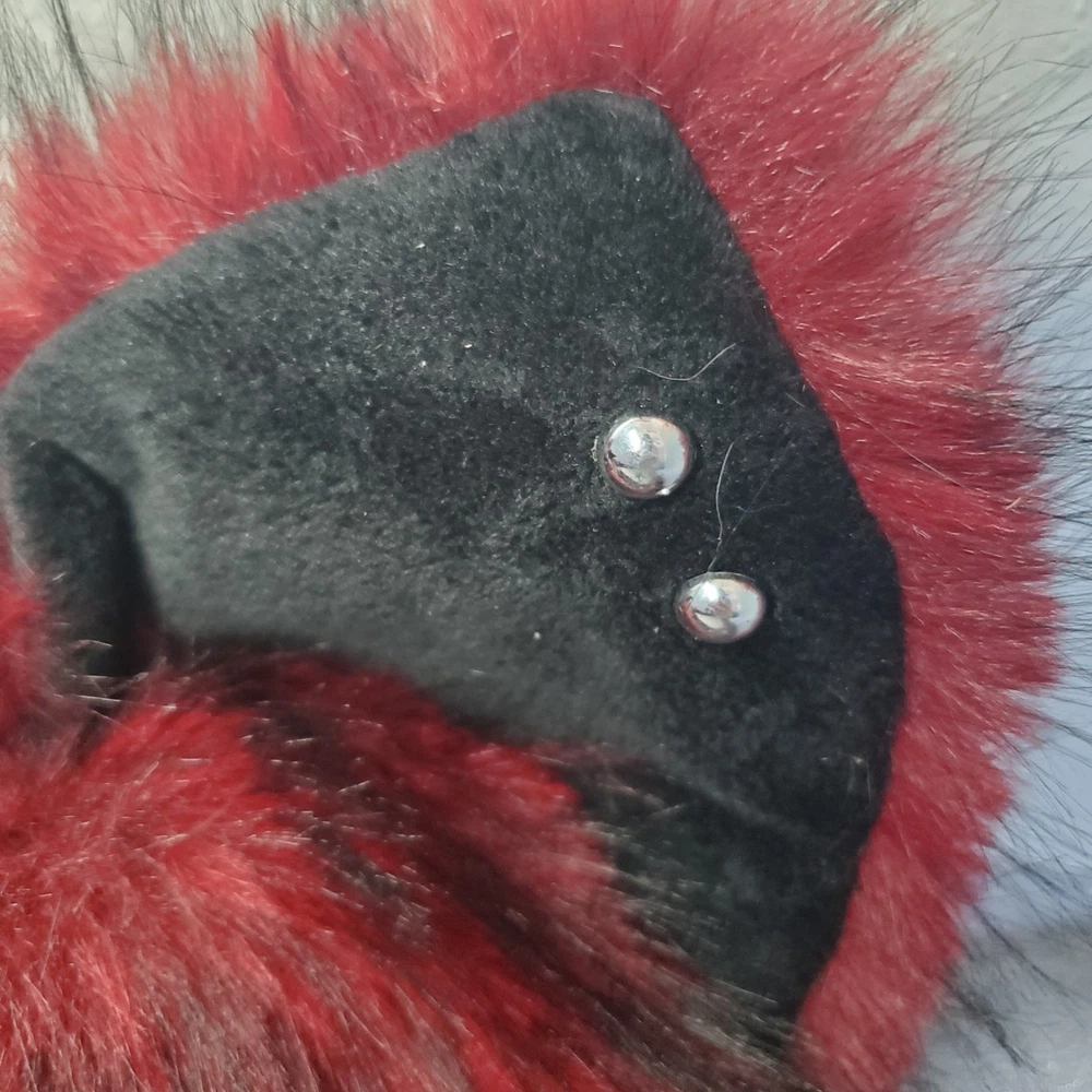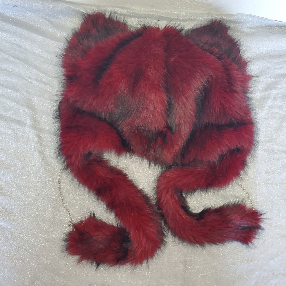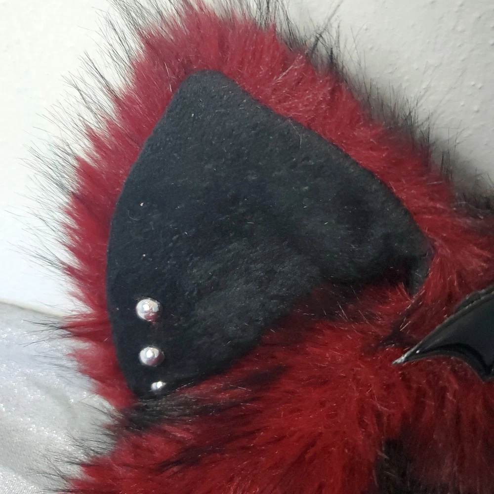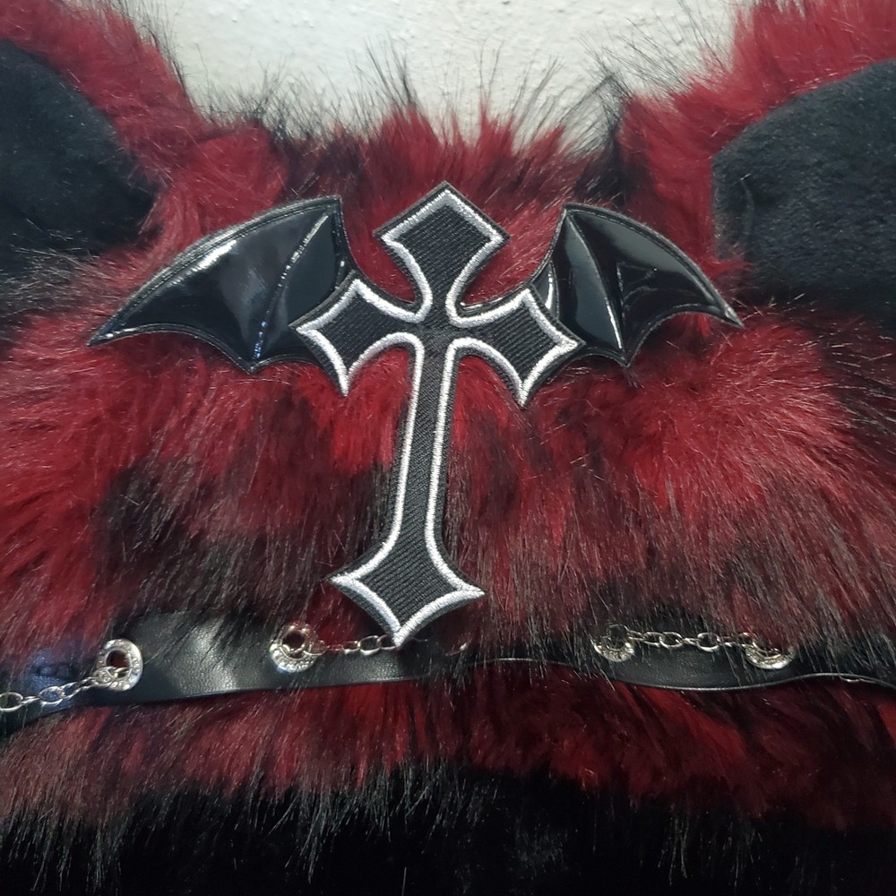 Handmade gothic lolita cat ear hat features plush burgundy and black faux fur with long dangling tassels. Adorned with a central embroidered cross with patent leather bat wings, the design includes silver-tone chain hardware, faux leather trim, and stud piercings on the ears. This unique headpiece captures a dark aesthetic perfect for cosplay or alternative fashion. Style: Gothic Lolita Material: Faux Fur, Faux Leather, Metal Color: Burgundy, Black, Silver Accents: Bat Wing Cross, Chains, Piercings, Long Tassels Keywords: Goth, Lolita, Cosplay, Cat Ears, Bat Wings, Vampire, Emo, Alt Fashion, Handmade, Faux Fur, Kawaii Goth, Mall Goth