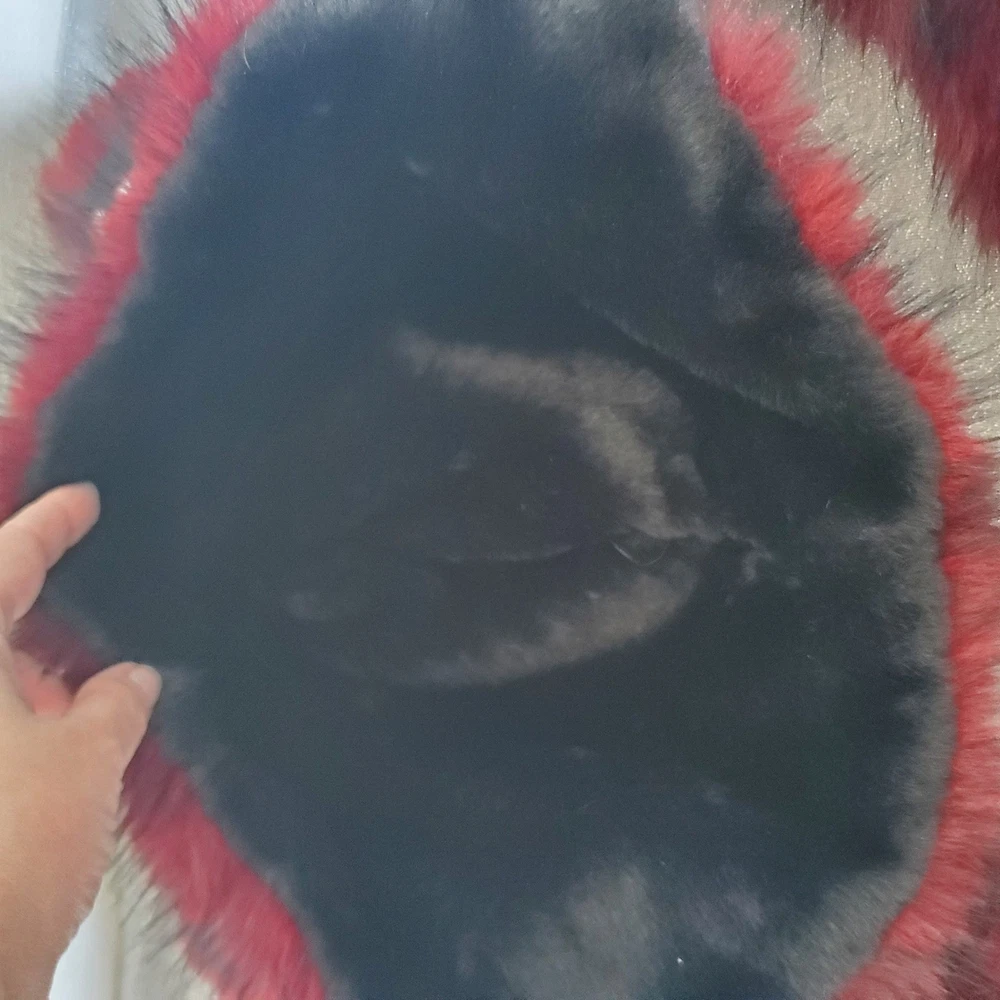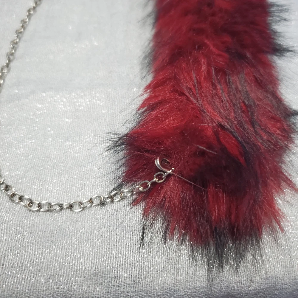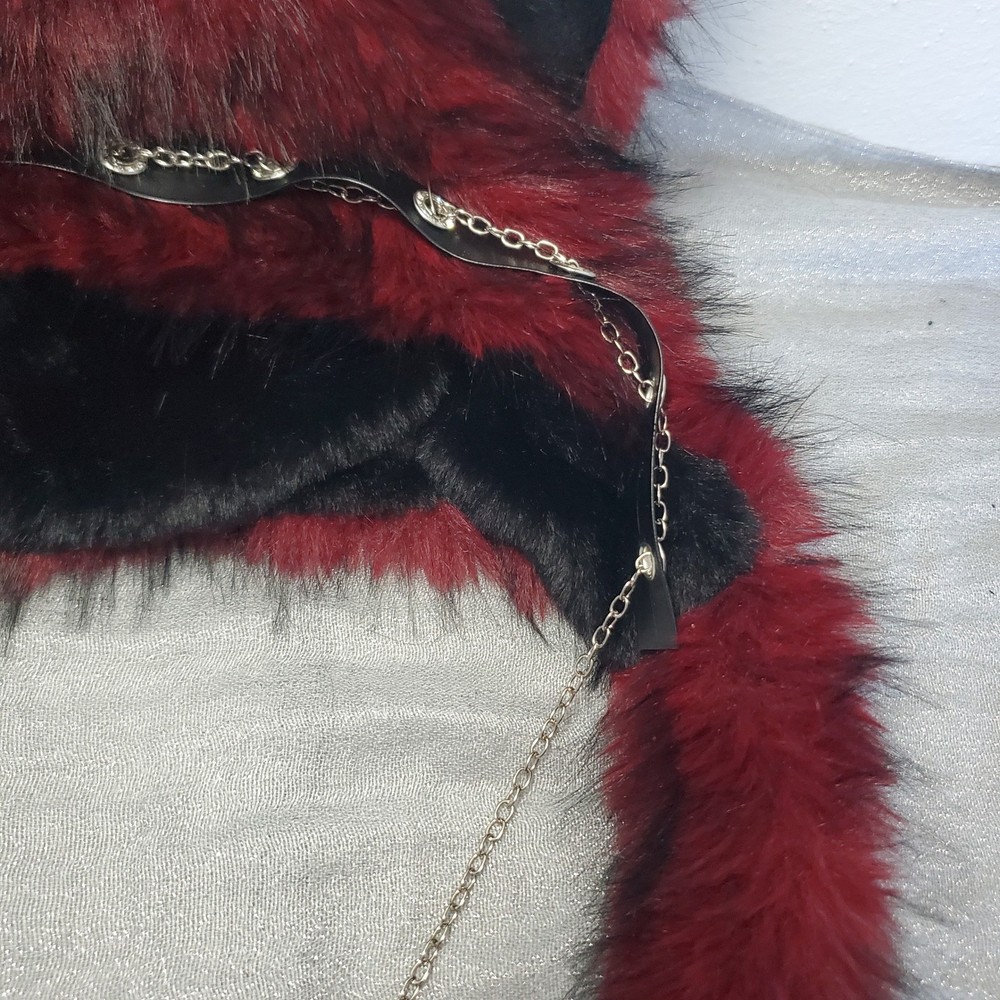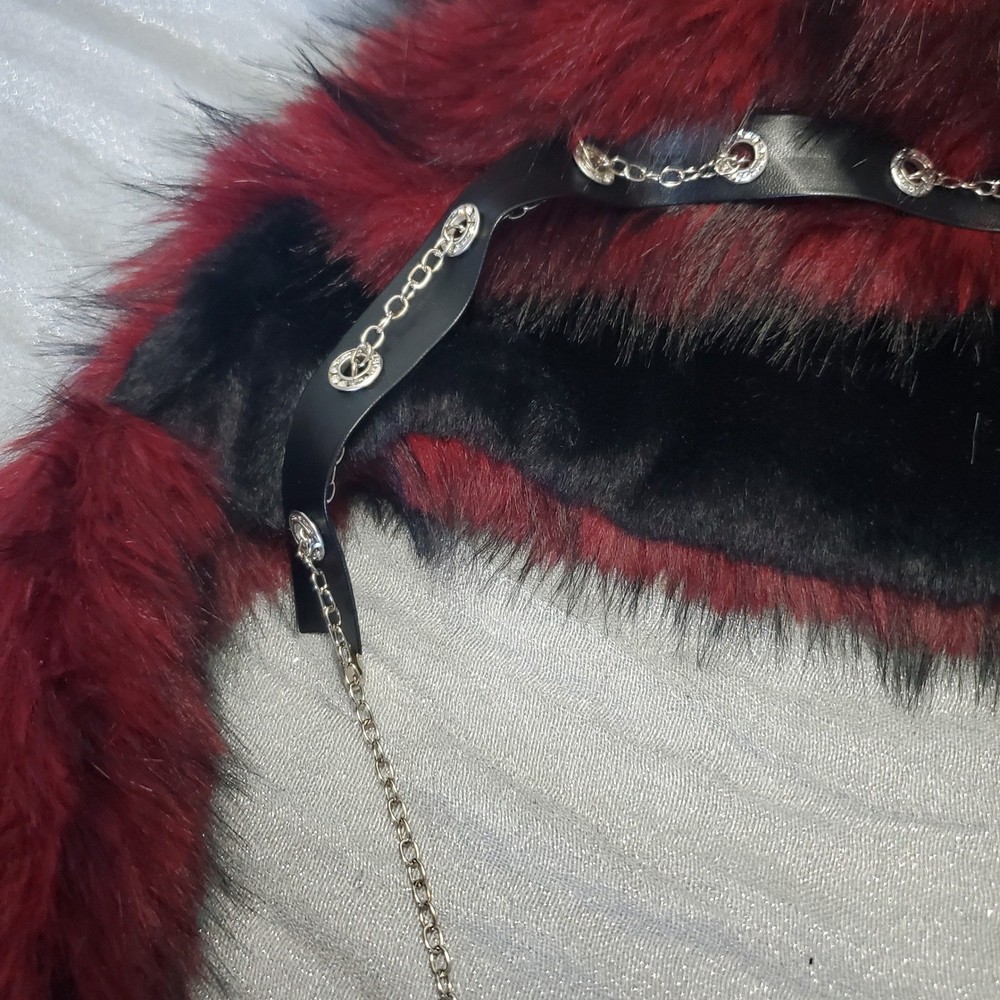 Handmade gothic lolita cat ear hat features plush burgundy and black faux fur with long dangling tassels. Adorned with a central embroidered cross with patent leather bat wings, the design includes silver-tone chain hardware, faux leather trim, and stud piercings on the ears. This unique headpiece captures a dark aesthetic perfect for cosplay or alternative fashion. Style: Gothic Lolita Material: Faux Fur, Faux Leather, Metal Color: Burgundy, Black, Silver Accents: Bat Wing Cross, Chains, Piercings, Long Tassels Keywords: Goth, Lolita, Cosplay, Cat Ears, Bat Wings, Vampire, Emo, Alt Fashion, Handmade, Faux Fur, Kawaii Goth, Mall Goth
