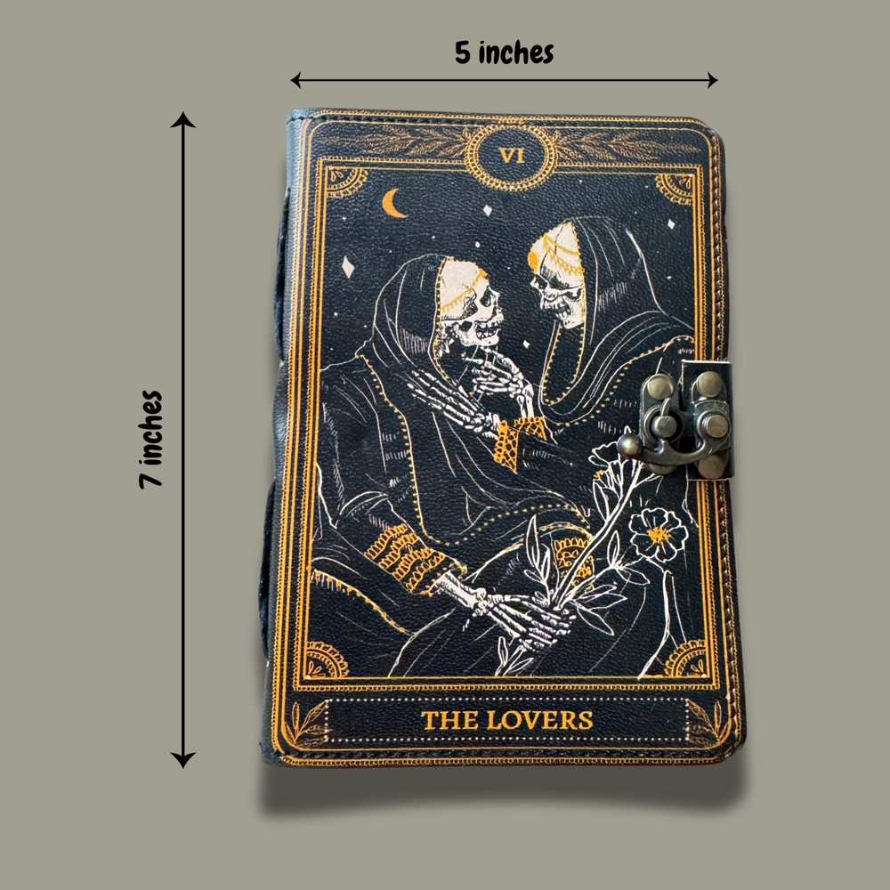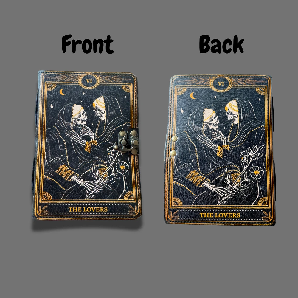 The Lovers Tarot Notebook – A Mystical Leather Grimoire Step into the realm of magic and mystery with The Lovers Tarot Notebook, an exquisite Leather Gothic Book of Spells designed for those who embrace the mystical and the macabre. Whether you're a devoted practitioner of the occult, a tarot enthusiast, or someone who appreciates dark and antique aesthetics, this Grimoire Printed Journal Notebook is your perfect companion. 📖 Features: Premium Leather Cover with a beautifully printed Lovers Tarot Card design, symbolizing destiny, duality, and deep connections. Aged antique-style pages that capture the essence of ancient spellbooks and secret grimoires. Compact yet spacious, making it ideal for spellwork, dream journaling, tarot readings, or personal musings. Gothic and mystical aesthetics, perfect for fans of Skull Lover artwork and vintage book collectors. Use it as a personal grimoire, a diary for your moon rituals, a spell journal, or an artistic notebook for your gothic poetry. This antique journal is more than just a notebook—it’s a portal to your thoughts, spells, and spiritual journey. 🎁 A Unique Gift for Gothic & Witchy Souls Looking for a mystical and meaningful gift? This Lovers Tarot Notebook makes a perfect choice for witches, tarot readers, gothic writers, and antique journal lovers. ✨ Let the magic of The Lovers guide your journey—order yours today! ✨ Ships from Melbourne within 1-2 business days via tracked postage.