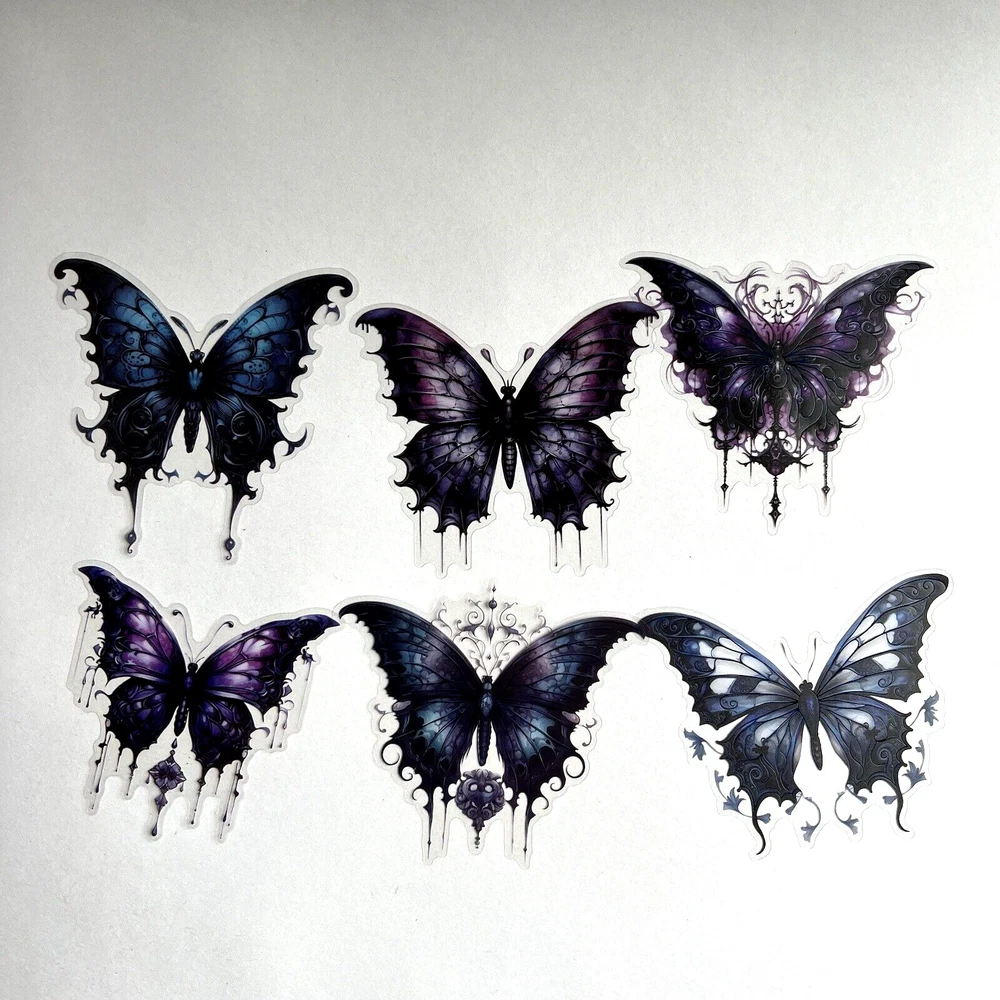 Gothic Butterfly stickers. Purple and blue. The black lines on the wings are slightly embossed. 12 stickers. 6 designs x 2. These are large flake stickers made out of PET (images printed on a clear flexible plastic with a clear peel off backing.) The sticker in the last photo measures approx. 3 5/8 x 3 1/4 inches. I have more stickers, washi tape and paper for sale. I do combine shipping. Please put all the items you want to purchase in ONE cart and then pay. I will refund you the difference in shipping after shipping label is printed. Let me know if you have any questions through eBay messaging. Thank you for stopping by!
