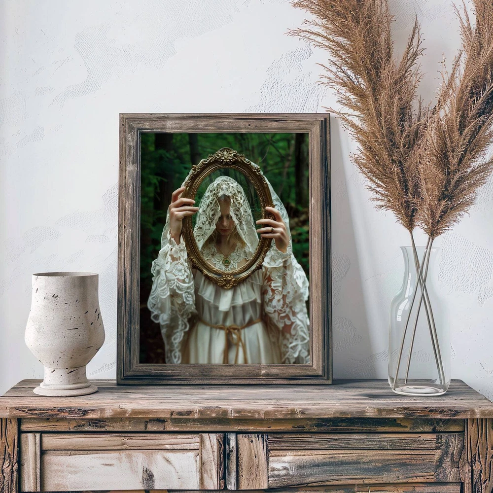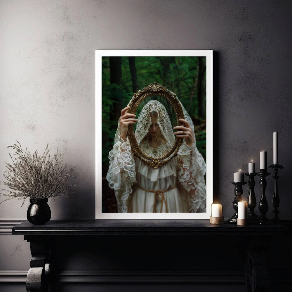 Gothic Woman With Mirror Art Print Dark Academia And Moody Victorian Decor Cottagecore Wall Art Material: Premium luster photo paper Print type: Inkjet printing One side printed + The finish provides the highest possible resolution and color saturation + Lasts up to 200 years in color and 400 years in black-and-white + Printed on high-quality resin-coated photo base paper medium + Posters can be hung with double-sided tape, tacks, or framed + Hand washing with a gentle cry cloth is recommended for extended durability I will hand select the best choice of paper for your chosen design to ensure top quality results for a beautiful, bright and luxurious print. All prints are sealed in cellophane slips for protection during transportation, and are shipped in a protective cardboard envelope.