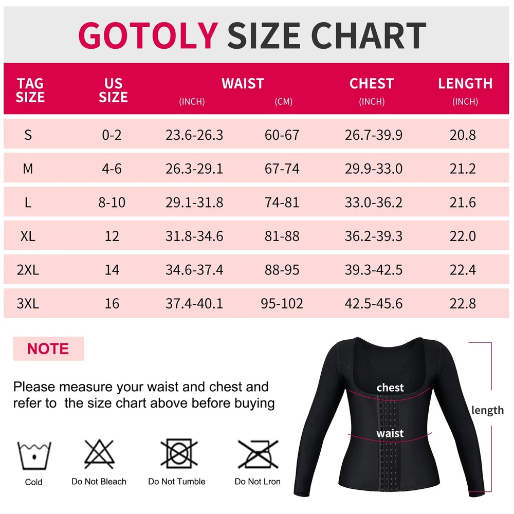 Gotoly Women Waist Trainer Slim Shapewear Tummy Control Corset Post Surgical Compression Top (Black, Medium) FABRICS THAT CARE ABOUT YOUR SKIN : This liposuction shapewear is made of high quality soft fabrics, which are smooth, healthy, moisture wicking, elastic and stretchable, flexible and breathable, comfortable to wear, all to care your sensitive skin on your surgery recovery process UPPER ARM SHAPER COMPRESSION : Our waist training corset design with high stretchable long sleeve, best for arm liposuction recovery to tighten loose skin, smooths and tights bumps and bulges, reduce arm and back flab, hide your back rolls, give your a slimmer figure. If you no need too tight,we suggest you to have the bigger size. HIGHLIGHTS THE CONTOURS OF THE BODY : this waist trainer bodysuit's middle part is 2-layer stretchy material,provide super high compression on tummy,hold stomach in,help reduce waistline and support back, front 4 hooks allow you to adjust the tightness you want, and U-shape push up breast design makes your chest more attractive, give you a beautiful hourglass figure. WORK AS POSTURE CORRECTOR : women's shapewear bodysuits have unique x-type belt with a cross back can pull up your shoulder back to keep you in good posture, effective waist cincher, improve your posture and humpback, accelerate slimming, makes you more and more confident. INSIDE UNIQUE INVISIBLE SEAMS: our body shaper for women can effectively reduce skin friction,and is the ideal shapewear for you! shapewear Shipping We offer FREE shipping on all orders! We ship within Three business days of payment, usually sooner. We use a selection of shipping services such as UPS, FedEx, USPS etc. We only ship to the lower 48 states, no APO/FPO addresses or PO Boxes allowed. Local pickups and combined shipping options are not provided at this time. Return You can return a product for up to 30 days from the date you purchased it. Any product you return must be in the same condition you received it and in the original packaging. Please keep the receipt. Payment We accept payment by any of the following methods: PayPal Please pay as soon as possible after winning an auction, as that will allow us to post your item to you sooner! Feedback Customer satisfaction is very important to us. If you have any problem with your order, please contact us and we will do our best to make you satisfied. Contact Us If you have any queries, please contact us via ebay. We usually respond within 24 hours on weekdays. Please visit our eBay store to check out other items for sale! Thank you for shopping at our store.
