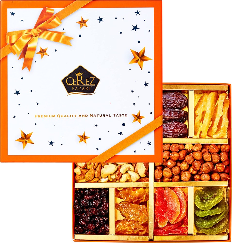 Experience the delicious taste of holiday nut and dried fruit gift basket 1.32lbs net product. 10 varitey marble gift box for your loved ones. EAN: 8699413721873, Made in Türkiye EXPERIENCE THE DELICIOUS TASTE OF HOLIDAY NUT AND DRIED FRUIT BASKET: Witness The Original, Mouth Watering And Pure Nuts and Dried Fruits Food Gift- A gourmet selection of ten variety arrangement of fresh & delicious hand picked nuts and dried fruits including Dried Turkish Malatya Apricots,Jumbo Medjoul Dates,Dried Kiwi,Dried Pineapple,Dried Papaya,Dried Pitted Anatolian Prunes,Dried Cranberries,Dried Pears Presented in a embossed stylish giftable large marble desing box. RAW AND EXOTIC INGREDIENTS: As Cerez Pazari we dedicate our selves to introduce you natural nuts and dried fruits freshly packed in Turkey. You can feel the difference of quality as soon as you open the lid, smelling the great scent of nuts and dried fruits.Our Nuts and Dried Fruits Holiday Gift basket contains lots of healthy fats,vitamins and mineral fiber, protein, magnesium ,vitamin E,copper, thiamine, zinc, antioxidants, selenium, potassium, vitamin C, iron, calcium, iron. USER FRIENDLY AND LUXURY GIFT BASKET DESING –Stylish and attractive, this luxury gift box has a reversible cover. It can be used as a corner stand. Raise the bar and eyebrows at once! Marble themed luxury gift basket can be used as a corner stand. Each box arrives wrapped to promote hygiene safety, freshness and cleanliness for sharing.Cerez Pazari Nuts and Dried Fruits Holiday Gift Basket presented in 6 parts inside separator to keep all goods properly away from each other. DELIGHTFUL GIFT BASKET FOR ANY OCCASION – Unforgettable,nicely designed and healthy gift for Family,New Year’s, Office,Party,Birthday,Holiday,Thanksgiving,Christmas, Mother’s Day, Romantic Halloween Gift Basket. This Special Gift Box Can Be Sent Your Loved Ones Who Are Vegan Or Dairy Free Diet. Enjoy the festive season with Cerez Pazari’s hand picked Dried Fruits and Nuts.All of our gift boxes are being prepared with care and experience for you and your beloved ones. This mix is Pareve. (CRZ) CEREZ PAZARI: One Of the Biggest Gourmet Food Provider For Over 400 Luxury Hotels And Restaurants In Turkey. We are not a 3rd party re-seller, we are the manufacturer and have a U.S. based company.Nuts and Dried Fruit Holiday Gift Basket is imported fresh from Istanbul, Turkey. All of our products are made freshly, prepared and packed with care in our hygienic production facility.