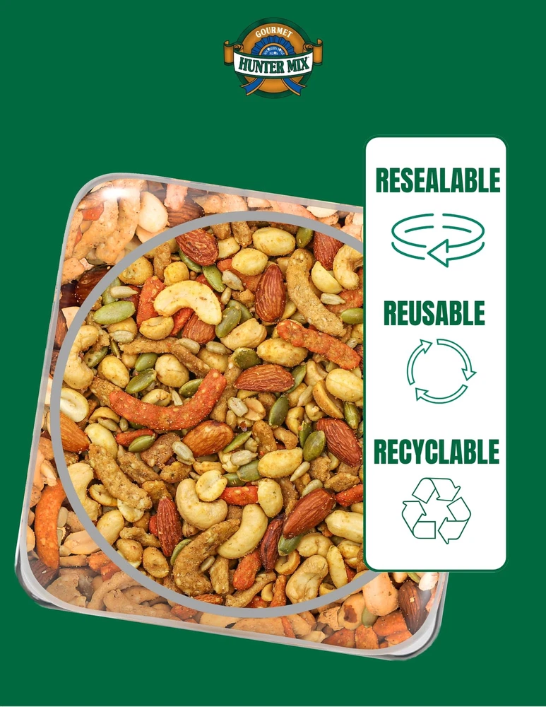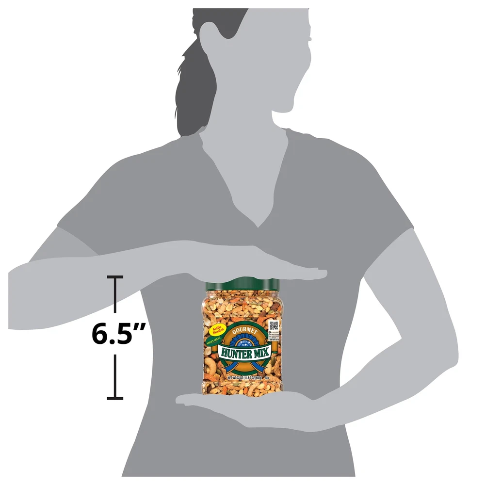 Gourmet Hunter Mix is a one-size-fits-all trail mix for those of us who like savory snacks. With whole cashews, almonds, peanuts and a crunchy variety of sesame sticks and seeds, seasoned with our special blend of spices, it’s hard to decide what to eat first. So, whether you prefer “hunting” for individual items or just grabbing a handful on the run, please enjoy. Many words can be used to describe — Delicious. Magnificent. Irresistible. But when it comes to producing quality products at a fair price, only one word is appropriate — unmatched. Our company was established as a simple purveyor of peanuts and has blossomed into a beloved brand known for distinctive and satisfying nut blends. Please enjoy and savor our products… for the love of snacking. Contains 1- 23 Ounce reusable canister of Gourmet Hunter Mix A flavorful crunchy mix of sesame sticks, peanuts, sunflower kernels, almonds, cashews, and pepitas all seasoned with a special blend of spices Gourmet Hunter Mix is a unique blend of roasted nuts and flavorful, crunchy sesame sticks that's vegetarian and provides 5 grams of protein per serving Our family sized resealable containers are perfect for sharing your favorite snack mix with the important people in your life Many words can be used to describe - Delicious. Magnificent. Irresistible