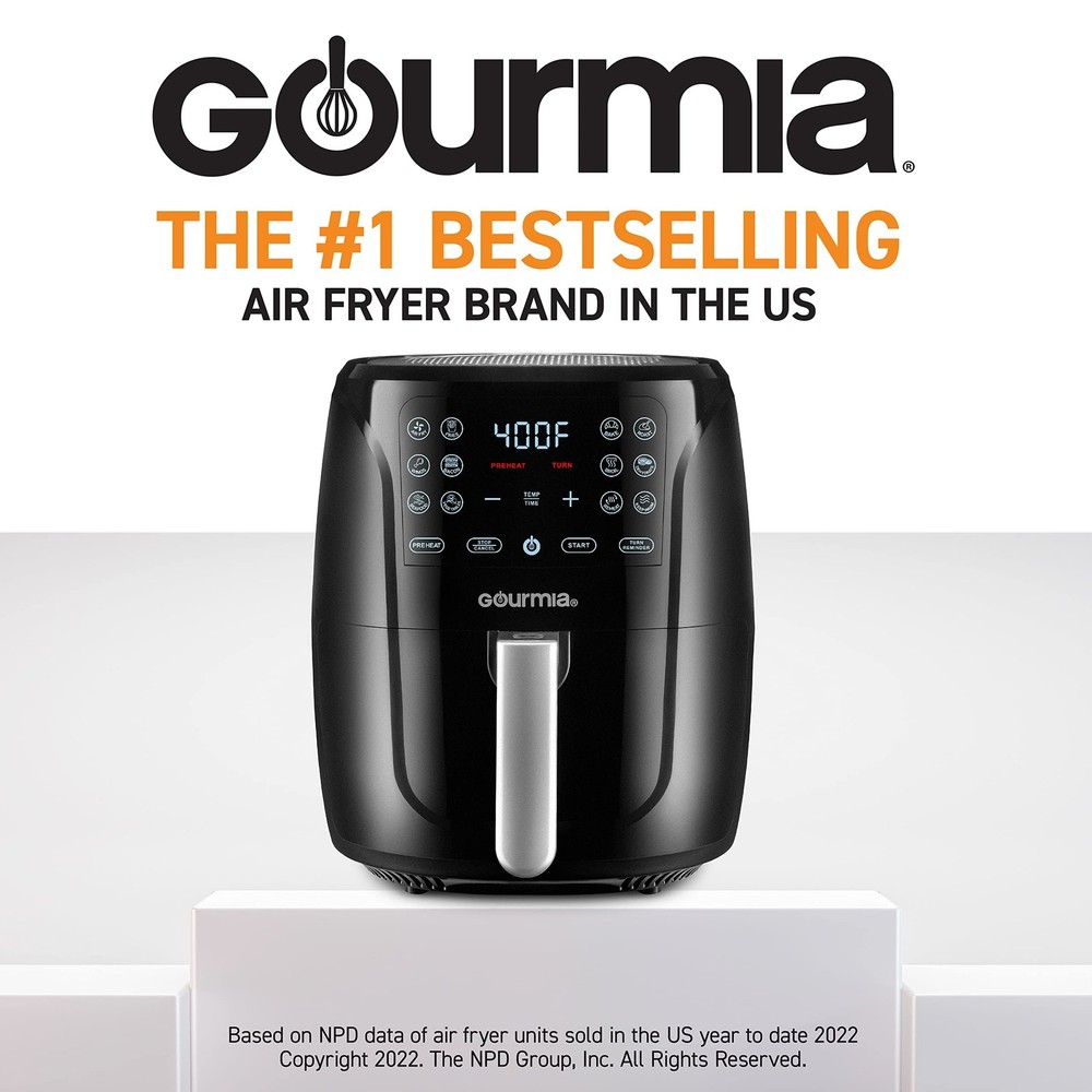 Gourmia Air Fryer Oven Digital Display 6 Quart Large AirFryer Cooker 12 1-Touch Cooking Presets, XL Air Fryer Basket 1500w Power Multifunction Black and Stainless Steel Accents FRY FORCE GAF686 Product Details Size: 6 Quart Brand: Gourmia MPN: GAF686 UPC: 810002862274 EAN: 0810002862274 Special Feature: Temperature Control, Timer, Automatic Shut-Off, Programmable Product Dimensions: 13.58"D x 11.54"W x 13.2"H Color: Black Capacity: 6 Quarts Material: Plastic Special Feature: Temperature Control, Timer, Automatic Shut-Off, Programmable Product Dimensions: 13.58"D x 11.54"W x 13.2"H Color: Black Capacity: 6 Quarts Material: Plastic Recommended Uses For Product: Roast, Broil, Bake, Defrost, Dehydrate Output Wattage: 1500 Watts Item Weight: 8.8 Pounds Brand: Gourmia Wattage: 1500 watts Voltage: 120 Volts Control Method: Touch Model Name: GAF686 Has Nonstick Coating: Yes Inner Material: Stainless Steel Outer Material: Stainless Steel Controller Type: Touch control Is Dishwasher Safe: Yes Max Temperature Setting: 400 Degrees Fahrenheit UPC: 810002862274 Manufacturer: Gourmia Item Weight: 8.8 pounds Country of Origin: China Item model number: GAF686 Date First Available: November 29, 2021 GOURMIA is the #1 BESTSELLING Airfryer Brand in the USA in 2022! Gourmia delivers value and quality you can trust for your home essentials THE PERFECT KITCHEN COOKING GADGET - Multicooker Combo Electric Oven for French Fries, Wings, Fish Fryer, Bacon, Seafood, Vegetables, Bake, Roast, Broil, Dehydrate, Toaster, Reheat, and Keep Warm + 12 1-Touch Digital Presets that deliver the best results HEALTHIEST WAY TO FRY - All of the flavor and none of the guilt! Fat removal technology in the air fryer basket removes up to 90% of fat through the cooking process DISHWASHER SAFE: Cook Fast and Clean Fast! - Quick and easy cleanup, air fryer accessories go straight into the dish washer for cleaning bringing convenience to your kitchen must havescook modes COMPREHENSIVE WARRANTY: All air fryers from Gourmia include a 1 Year Comprehensive International Warranty for your peace of mind Effortlessly prepare all your favorite foods in one appliance. The Gourmia Digital Air Fryer Oven combines a toaster oven, air fryer, and dehydrator, efficiently maximizing your counter space. 16 easy-to-use presets make cooking popular items quick and easy. From healthy air fried foods, toast, breads, and pastries, to homemade pizza and smokey jerky, cook a variety of foods with just one tap.