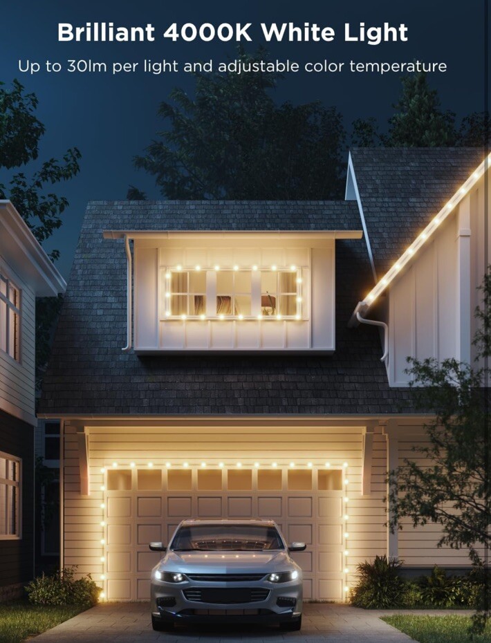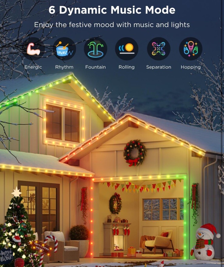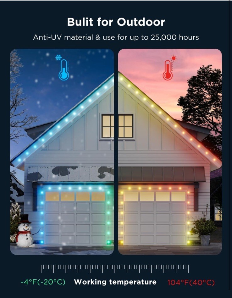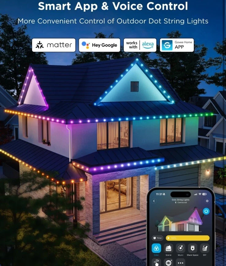 Festive RGBIC Lighting: Brighten your holidays with Govee Outdoor Dots String Lights. These Christmas lights outdoor offer 16 million colors and visualized lighting effects, transforming your garage, window, and eaves into a vibrant holiday decor. Bright and Adjustable Glow: Each LED Christmas lights emits a 4000K white light at 30lm, with adjustable warm cold color temperature and brightness settings. These outdoor Christmas lights are suitable for festive gatherings and house decor. Outdoor Durability: Even in -4℉ to 104℉ cold environments, these IP65 waterproof outdoor lights can function normally. Ideal for winter, lasting up to 25,000 hours, keeping your house and garage beautiful. Control box is IP65, adapter is IP44. Diverse Lighting Modes: Choose from 65 scene modes and 6 music modes to suit any festive occasion. With DIY and AI options through the Govee Home App, your govee outdoor lights can transfer effortlessly from Halloween lights to Christmas decorations. Smart App Control: Manage your Led lights easily with WiFi/Bluetooth and Govee Home App. Compatible with Alexa, Matter and Google Home. Adjust your lighting with a tap or voice command, adding a touch of magic to your Christmas decorations. Simple Installation: Install with ease using adhesive backing or screws. You can cut and reconnect the outdoor string lights to design your own unique layout. Notes: It is recommended to use screws when installing on a wooden surface.