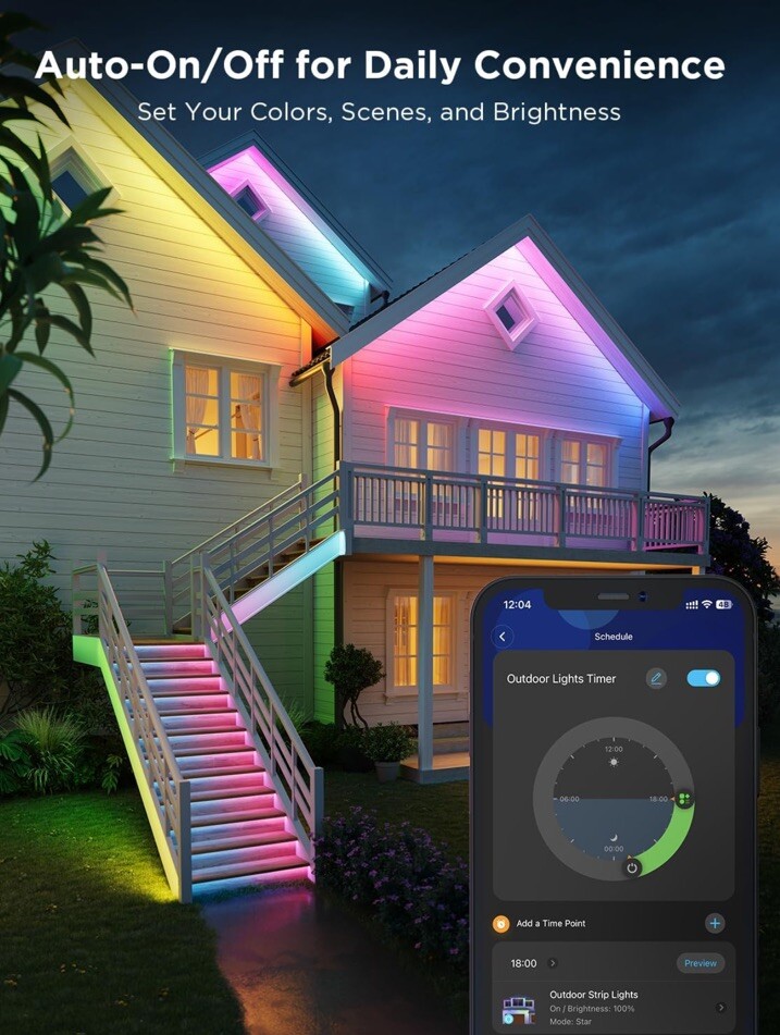 64 Scenes and Vivid Colors: Select from 64 preset holiday and festival-inspired scenes, including multiple festivals for outdoor Christmas decoration. Design eye-catching light effects for Govee outdoor LED srip lights on Govee Home App. Durable Protection: With an IP65 rating, this outdoor light strip is dust-tight and protected from low-pressure water jets coming from any angle. Built tough for outdoors, making them your go-to lights to serve as Christmas decor. Smart Wi-Fi Outdoor Lights: Install, leave, and enjoy your smart outdoor Christmas lights with easy app control. Set timers, choose colors or scenes, and adjust brightness levels to schedule your Govee outdoor lights around your daily routine. Sync with Music: Enhance your outdoor space with the music sync feature on Govee Home App. Dance the night away as the outdoor lights react to your songs via the integrated mic. Enjoy dynamic light shows during parties, gaming sessions, or workouts. Significant Length: The 98.4ft LED strip lights are devided into 3 connected 32.8ft rolls for easier installation and steadier power supply. Please note that the 3 Rolls waterproof light strips only come with 1 adapter and 1 control box.