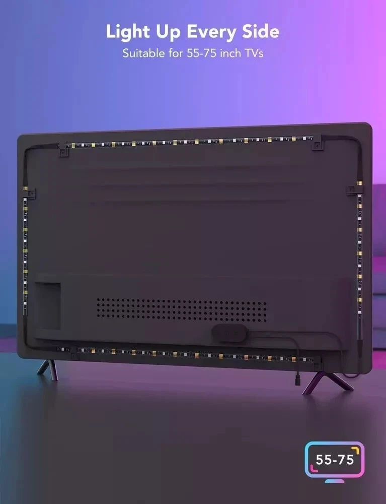 About this item A Symphony of RGBIC Lighting: Govee RGBIC technology realizes the color segmentation display of the TV lights behind, creating more dynamic and gorgeous lighting effects. Experience more vibrant colors in your TV lights and upgrade your visuals. App & Voice Control: Manage the LED TV lights via app or smart voice control with Alexa & Google Assistant. ( Please note that it won't capture colors automatically and support 2.4G only.) Multiple Preset Scenes: Govee Home App offers 99+ preset scene modes and 11 music modes, from which you can choose the lighting effects that suit your mood or the atmosphere around you to enhance your viewing. Music Sync: Govee TV LED Backlight includes a built-in mic, making the color and brightness sync with the music. Experience breathtaking lighting effects that dance with any audio as though you're at a concert. Flexible Installation: The 12.5ft TV backlight can easily cover 4 sides of any 55-65 inch TV. It is recommended to use the cable clips to secure the TV LED strip lights to make them snugly fit your TVs.