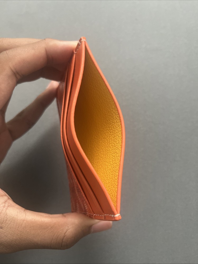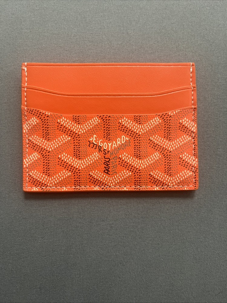 Goyard Orange Leather Card Holder Authentic Goyard card wallet in a rare orange color. Made in France from high-quality leather with the signature Goyard print. Slim, stylish, and easy to carry – perfect for holding cards and essentials. Gently used but in great condition. Don’t miss out on this statement piece.
