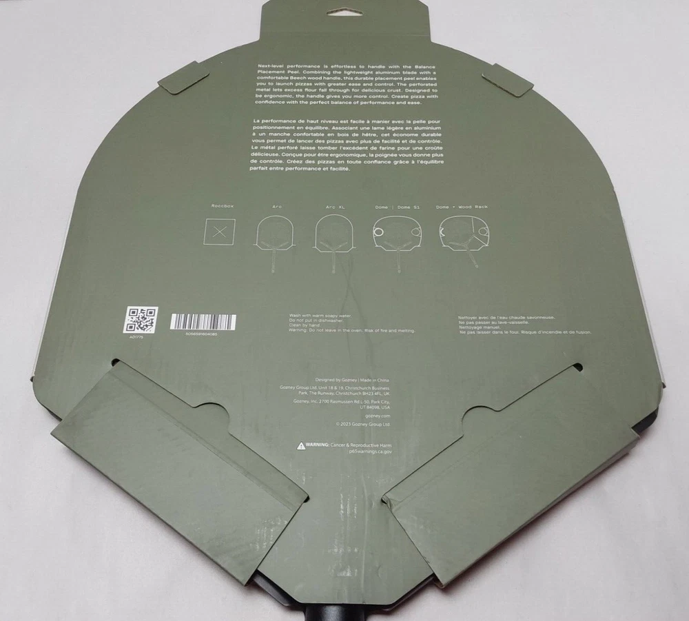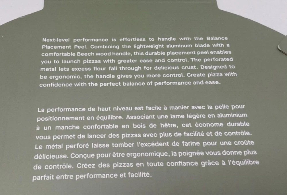 Next-level performance is effortless to handle with the Balance Placement Peel. Combining the lightweight aluminum blade with a comfortable Beech wood handle, this durable placement peel enables you to launch pizzas with greater ease and control. The blade is designed with a flat nose to increase stability and reduce rocking from side to side while sliding on or launching pizzas into the oven, so your pizza keeps its shape during transfer. The perforated metal lets excess flour fall through for delicious crust without the unwanted burnt taste. Designed to be ergonomic, the wood handle shifts the center of gravity closer to the hand for more control. The soft touch of the wooden handle is timeless and classic in its feel. Create pizza with confidence with the perfect balance of performance and ease. Highlights Flat-nosed perforated blade FSC sustainably sourced Beech wood handle Durable Ocean Bound Plastic Certified Recycled plastic mouldings Metal hanging loop Compatible with Arc, Arc XL, Dome S1, Dome, and Dome with wood rack