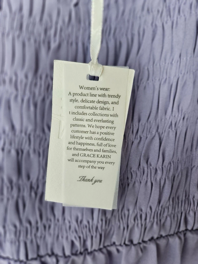 Add a touch of elegance and sophistication to your wardrobe with this stunning Grace Karin Lavender Roushed Too Spaghetti Strap Dress in size Small. With its solid pattern, strappy sleeves, and beautiful accents, this dress is perfect for any occasion, whether it be a wedding, party, casual outing, or even travel. The dress is made of a blend of polyester and viscose, making it comfortable and machine washable for easy maintenance. The fit and flare style of this dress is designed to flatter the figure, while the long length adds a touch of class. The dress is not only stylish but also versatile, making it a great addition to any wardrobe. Whether you're dressing up or down, this dress is sure to turn heads. So, why wait? Add this gorgeous Grace Karin dress to your collection today! Pit to Pit 12" (stretch material) Dress length from center chest is 42"
