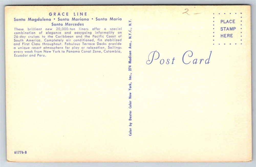 Grace Line New Santas Ships New York Cruises To South America C1939 Postcard G6 Thank you for visiting! This is a standard size postcard, 3.5" X 5.5". In stock, usually ships within 24 hours of your purchase. Please ask questions if you are unsure about anything. Our goal is for your complete satisfaction with the postcard and your experience. Check all my other listings in my store. RETIREDWITHBOOKS Powered by SixBit's eCommerce Solution