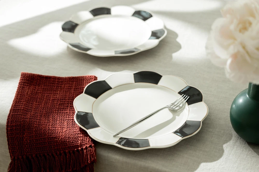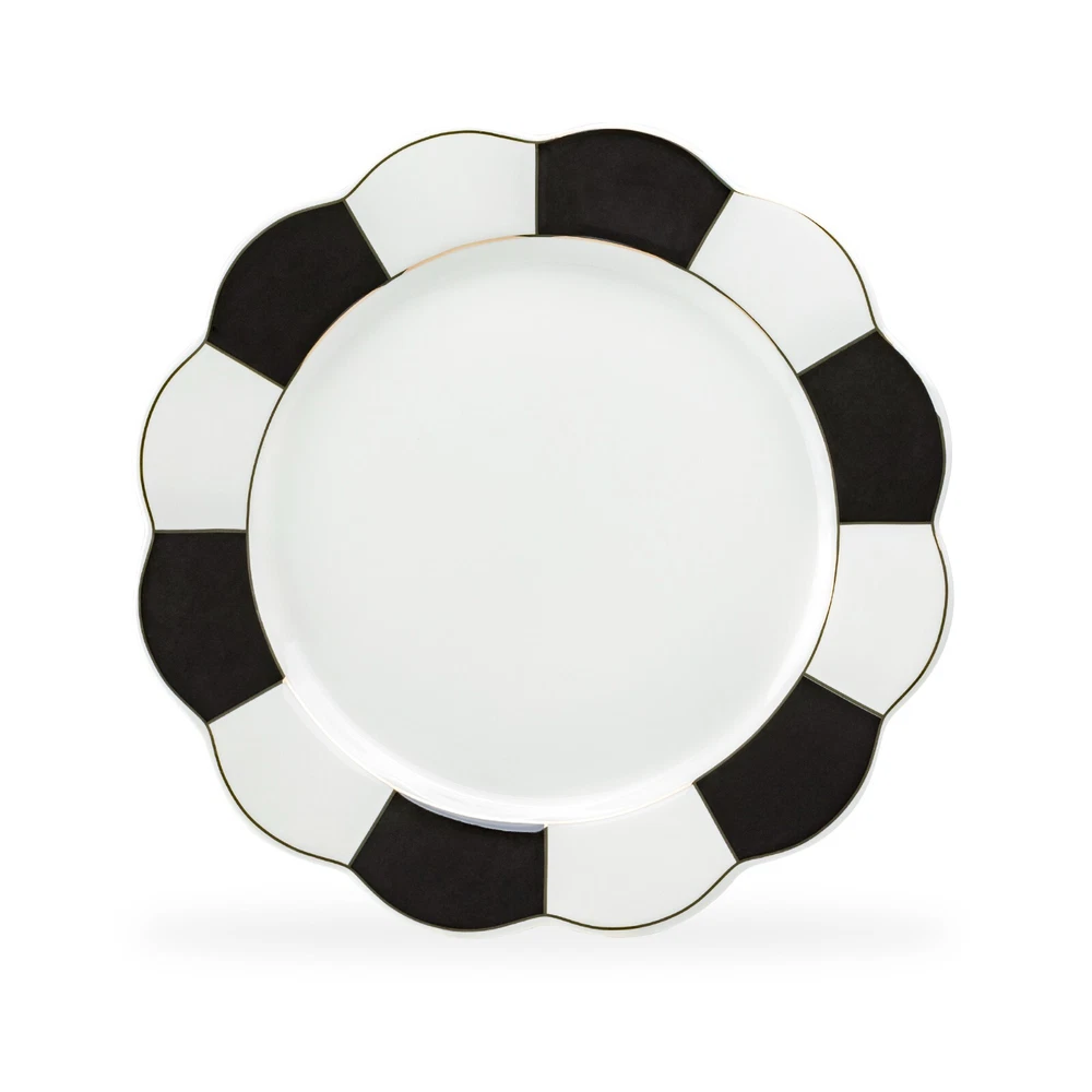 Care Instructions: Machine Washable Material: Porcelain, Gold Color: Black, White and Gold Original/Licensed Reproduction: Original Occasion: All Occasions Type: Dinner Plate Pattern: Solid Color Shape: Scallop Set Includes: Plate Set Style: Art Deco Brand: Grace's Teaware Plate Diameter: 11"