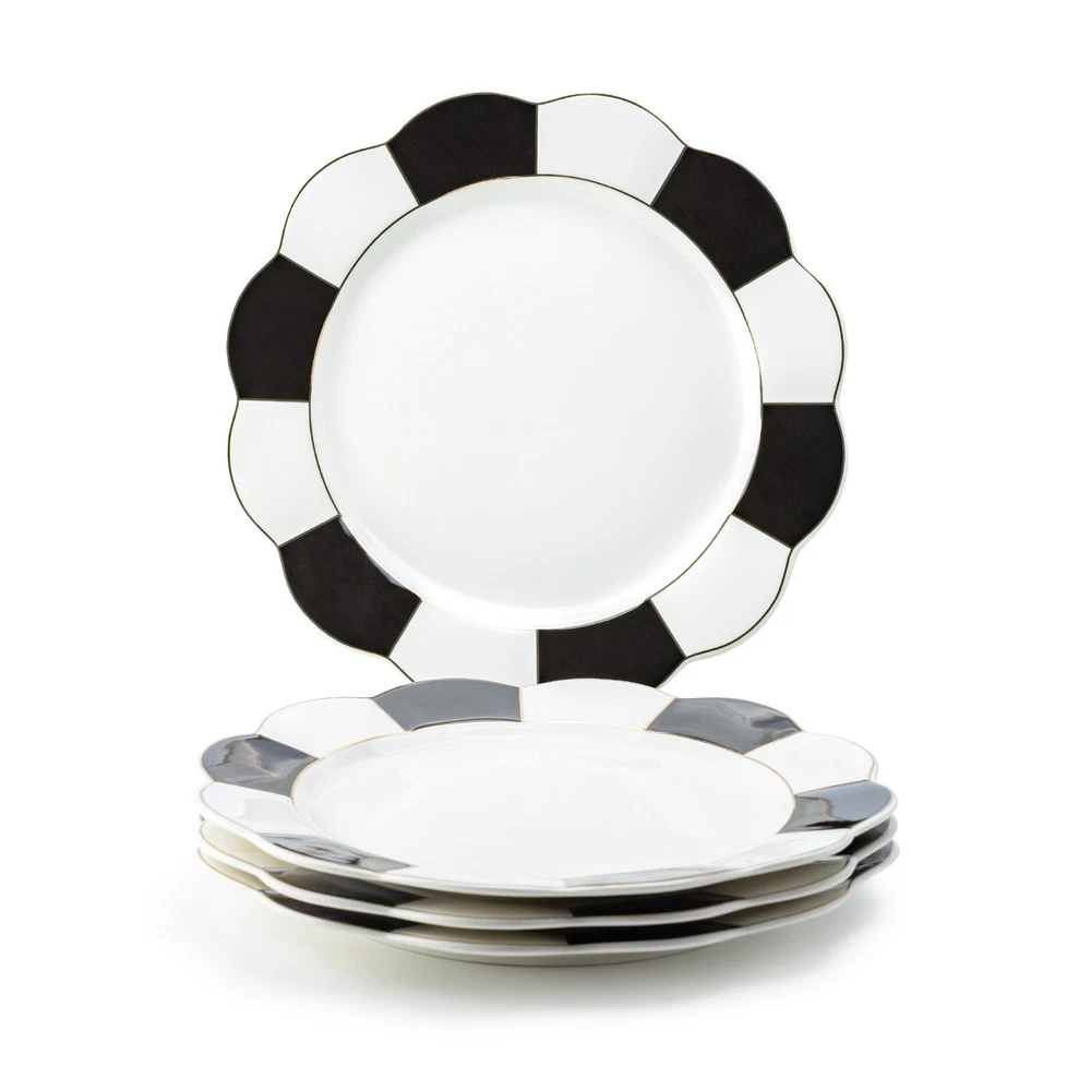 Grace Teaware 11" Black and White Scallop Fine Porcelain Dinner Set of 4