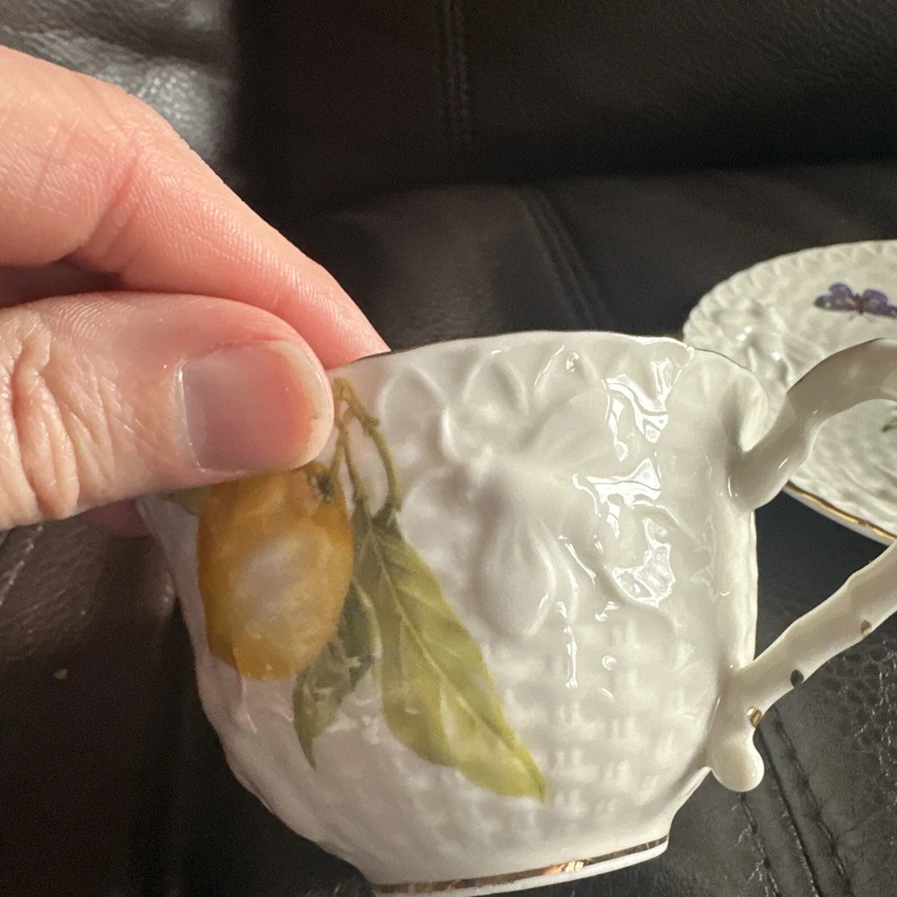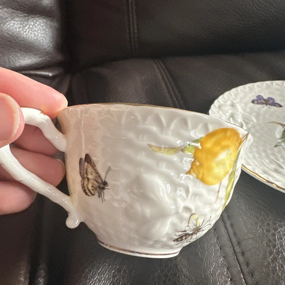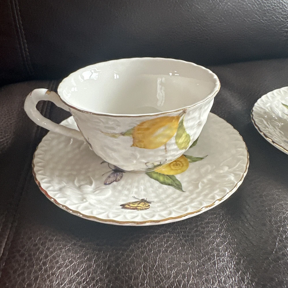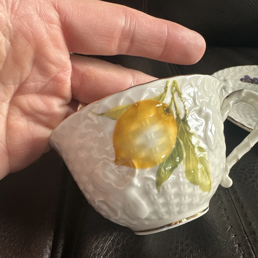 This beautiful ceramic cup and saucer set from Grace Teaware features a charming lemon fruit and butterfly design. The colorful and intricate details make it a great addition to any kitchen or dining room. Made for tea lovers, it's perfect for enjoying your favorite blends. The set is in great shape and ready for a new home. Crafted with care, this Grace Teaware set is perfect for adding a touch of elegance to your tea time routine. The multicolor design and butterfly theme are a perfect combination for nature lovers. The set has been previously enjoyed but is still in excellent condition.
