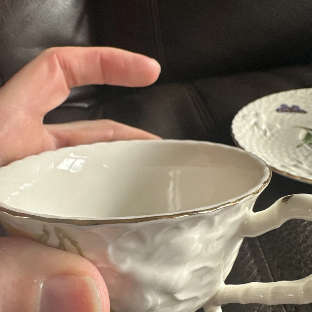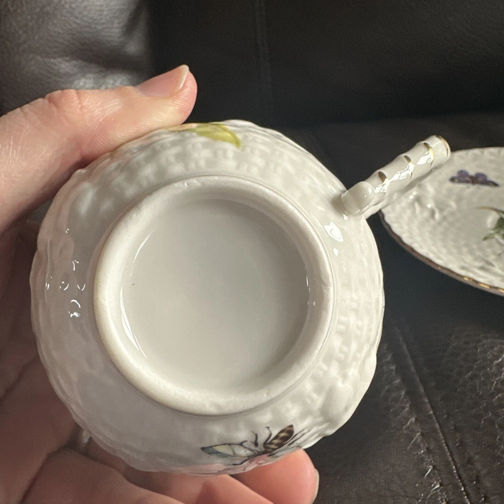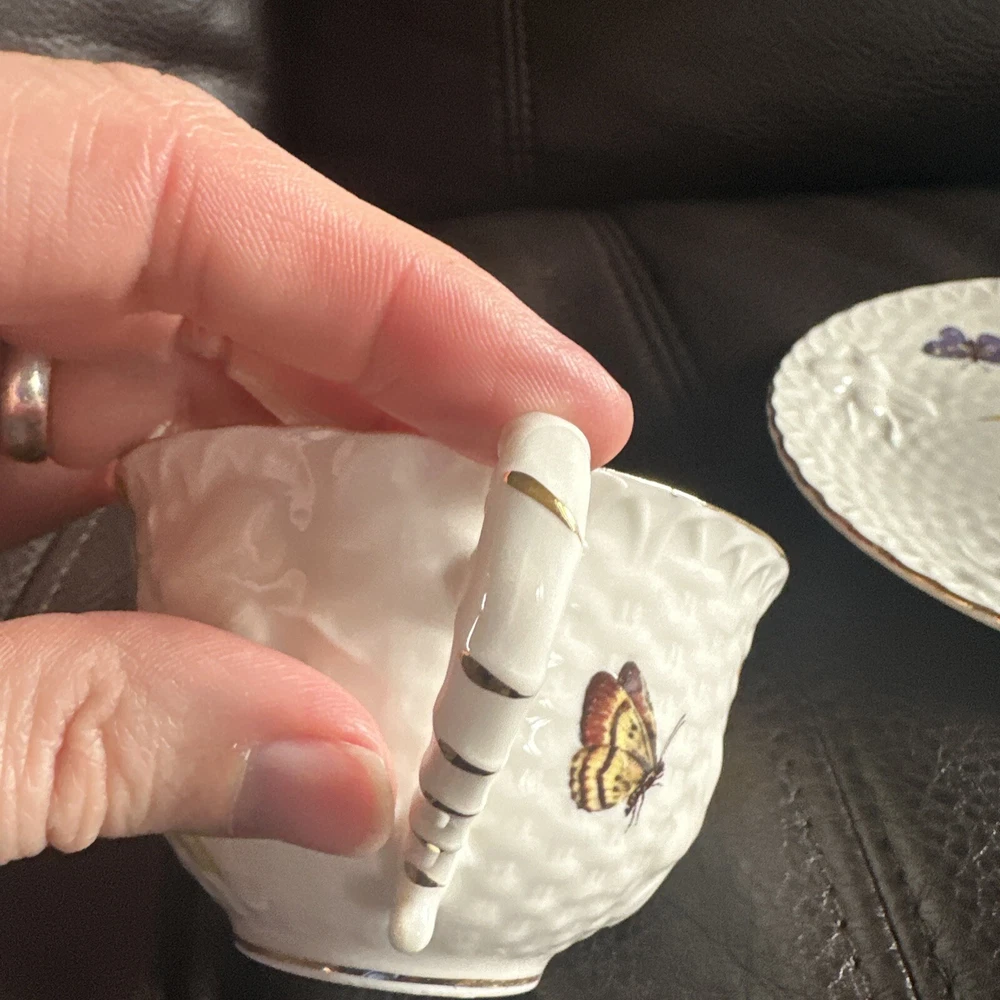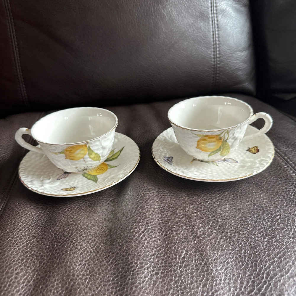 This beautiful ceramic cup and saucer set from Grace Teaware features a charming lemon fruit and butterfly design. The colorful and intricate details make it a great addition to any kitchen or dining room. Made for tea lovers, it's perfect for enjoying your favorite blends. The set is in great shape and ready for a new home. Crafted with care, this Grace Teaware set is perfect for adding a touch of elegance to your tea time routine. The multicolor design and butterfly theme are a perfect combination for nature lovers. The set has been previously enjoyed but is still in excellent condition.