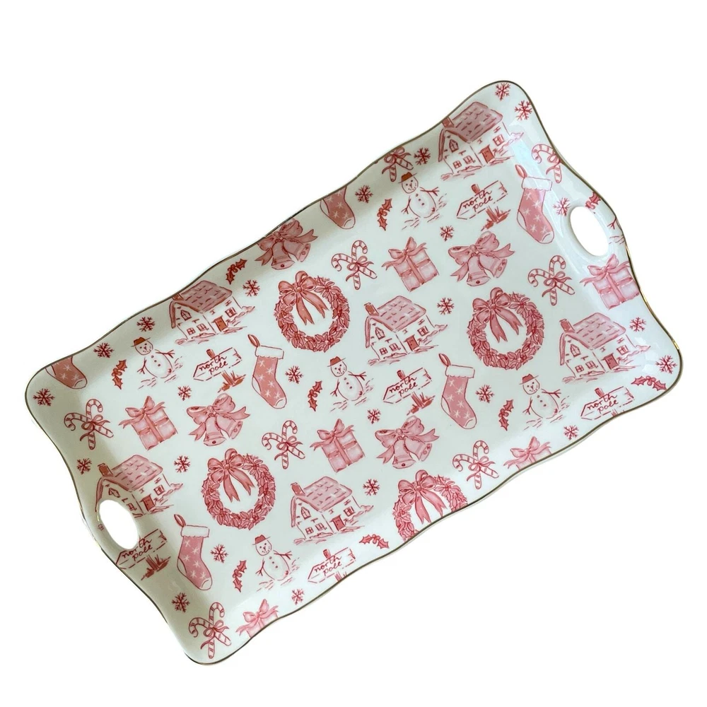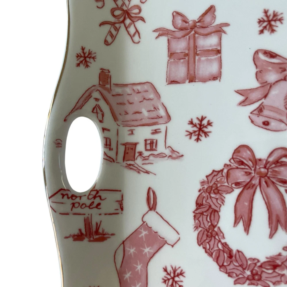 Grace Teaware Christmas Red & White Fine Porcelain Serving Tray 15in x 8.5in Brand New and BEAUTIFUL! Add a touch of elegance to your holiday table with this Grace's Teaware Christmas Serving Tray. A rectangular ceramic tray with scalloped edges and handles on either side for easy carrying. The design features a whimsical red-and-white Christmas motif with various holiday-themed illustrations. These include snowmen, wreaths, bows, gift boxes, candy canes, stockings, and small cottages, creating a charming winter village scene. Red and White color 15in L x 8.5in W Holiday Themed Scalloped edges Built-in handles Fine Porcelain Not Microwave Safe Dishwasher Safe Made in China Highly Rated FAST Shipper (by next day) Ships from Houston, Texas Smoke Free Home Thank you for checking out my store! Please follow me as I list new things DAILY:) Fall, Winter, Fall Essentials, Home, Kitchen, Dining Room, Indoor, Outdoor, Stylish, Trending, Christmas, Grace Teaware, Red, White, Home Decor, Shabby Chic, Holiday, Gift, Mothers Day, Merry Christmas